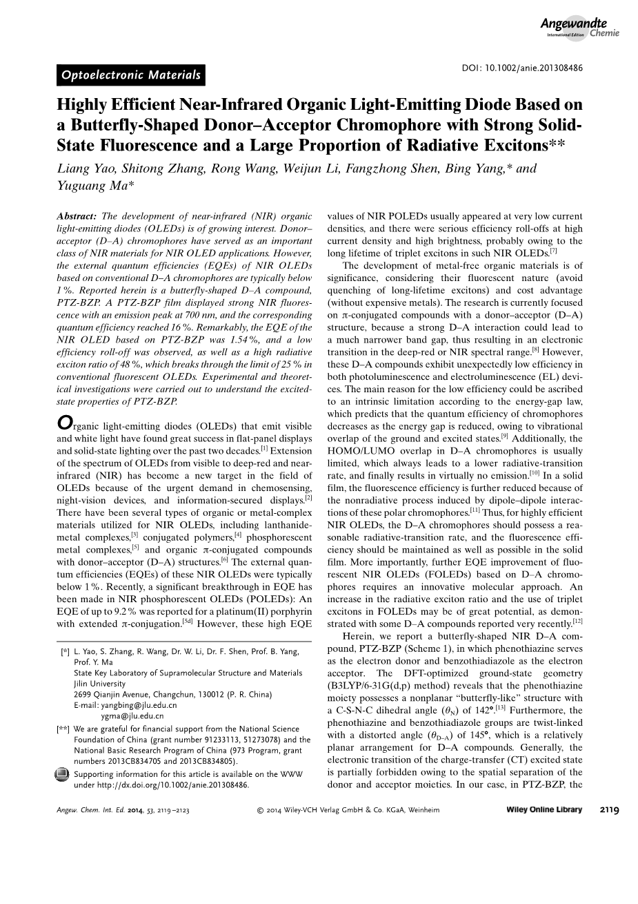 摘要:近红外(NIR)有机发光二极管(OLEDs)的发展受到越来越多的关注。供体—受体(D-A)发色团是近红外OLED中一类重要的近红外材料。然而,基于传统D-A发色团的近红外有机发光二极管的外部量子效率(EQEs)通常低于1%。本文报告的是蝴蝶形的D-A化合物PTZ-BZP。PTZ-BZP薄膜显示出强烈的近红外荧光,其发射峰在700 nm处,对应的量子效率达到16%。值得注意的是,基于PTZ-BZP的近红外OLED的EQE为1.54%,并且观察到低效率的衰减,以及高达48%的辐射激子比,突破了传统荧光OLED 25%的极限。为了了解PTZ-BZP的激发态特性,进行了实验和理论研究。