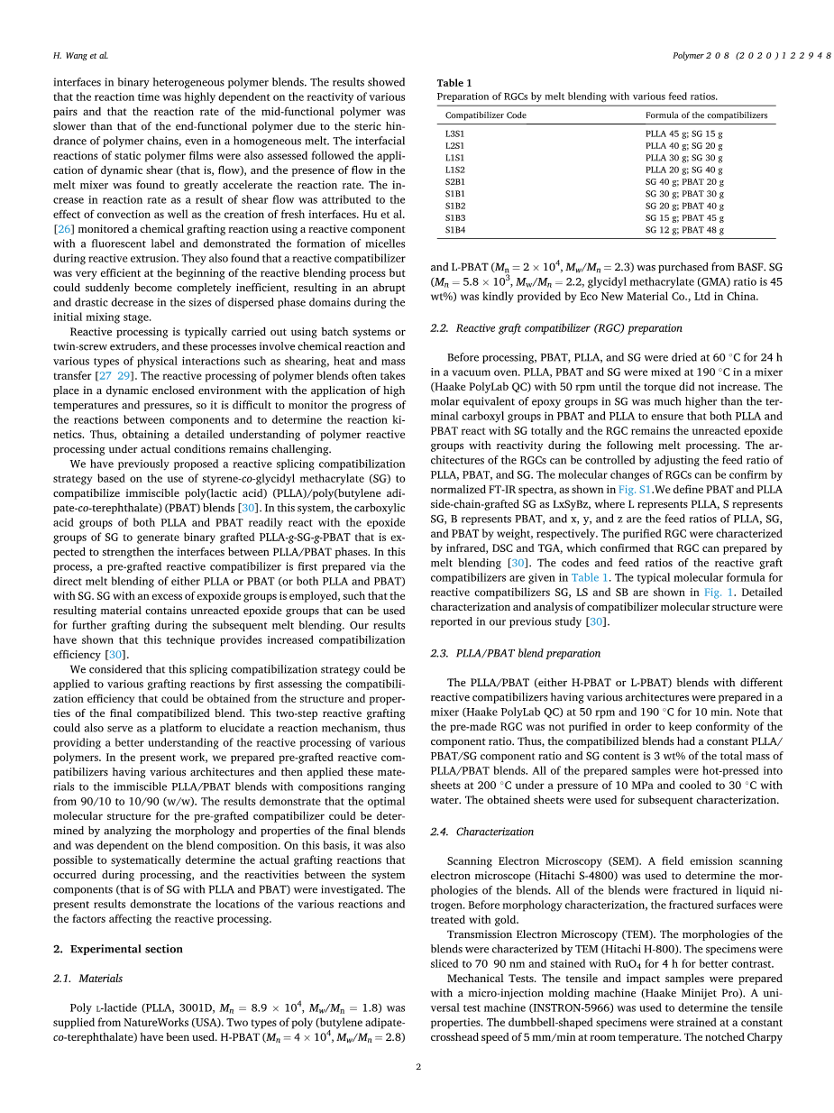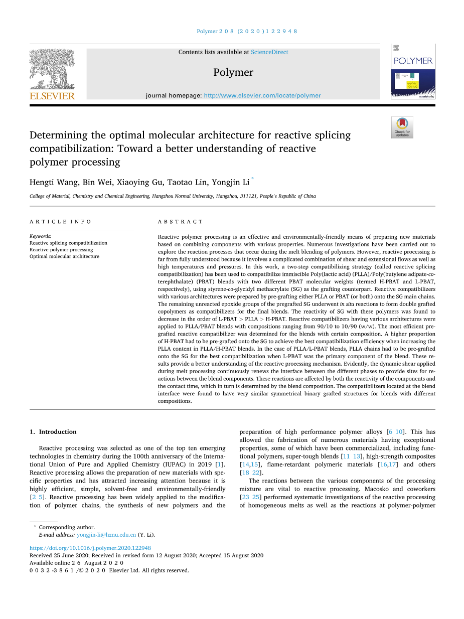聚L-丙交酯(PLLA,3001D,Mn=8.9times;,Mw/Mn=1.8)由美国NatureWorks公司提供,本文使用了两种类型的聚己二酸丁二烯-对苯二甲酸酯,H-PBAT(Mn=,4times;,Mw/Mn=2.8)和L-PBAT (Mn=2times;,Mw/Mn=2.3)购自BASF,SG(Mn=5.8times;,Mw/Mn=2.2,甲基丙烯酸缩水甘油酯(GMA)比例为45wt%)由中国Eco新材料有限公司提供。