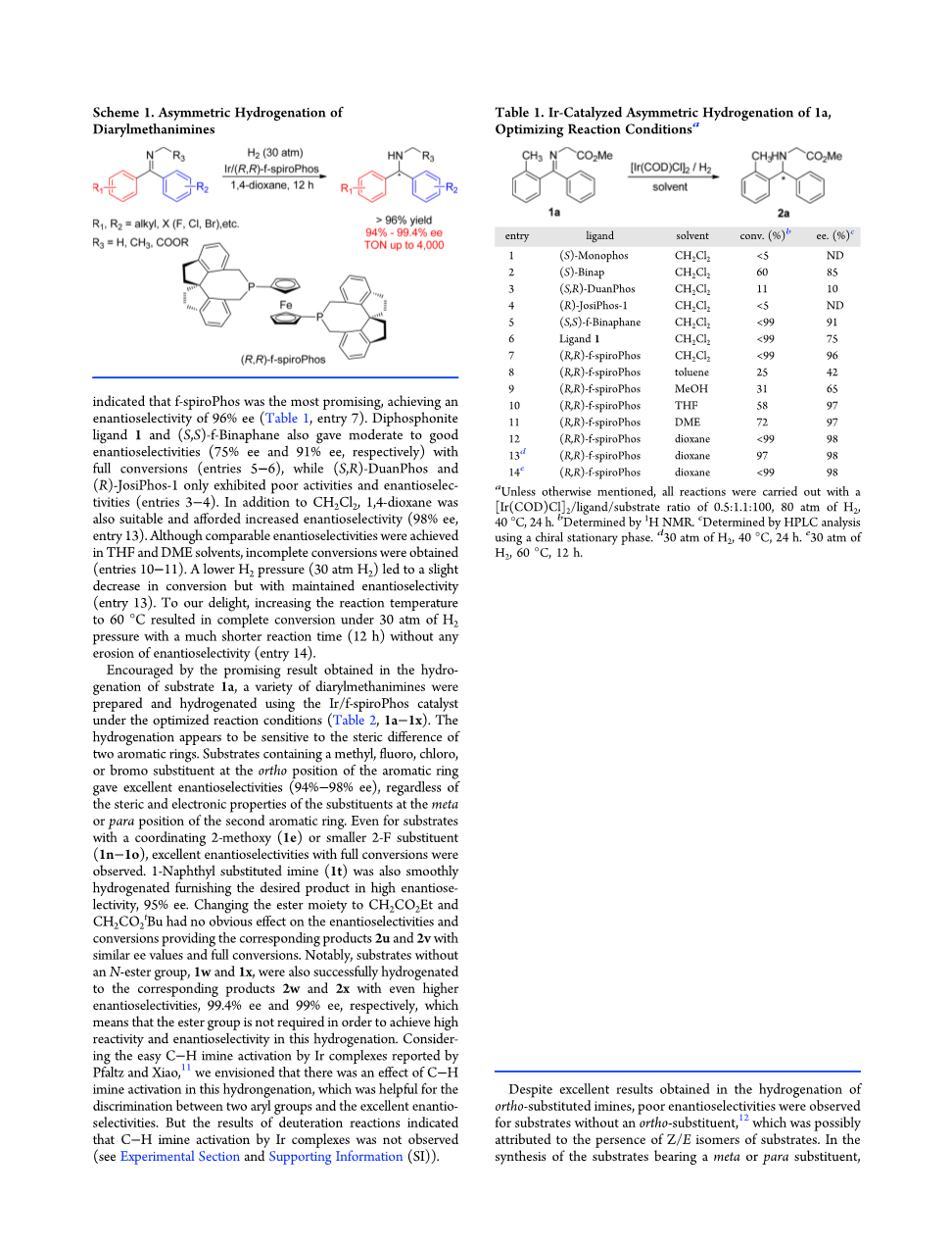总之,通过使用具有手性f-spiroPhos配体的铱催化剂,首先在温和条件下实现了N-取代的二芳基甲亚胺的对映选择性氢化。该反应提供了具有优异对映选择性(高达99.4%ee)和高周转数(高达4000)的各种手性二芳基二甲胺的不对称合成的有效途径。