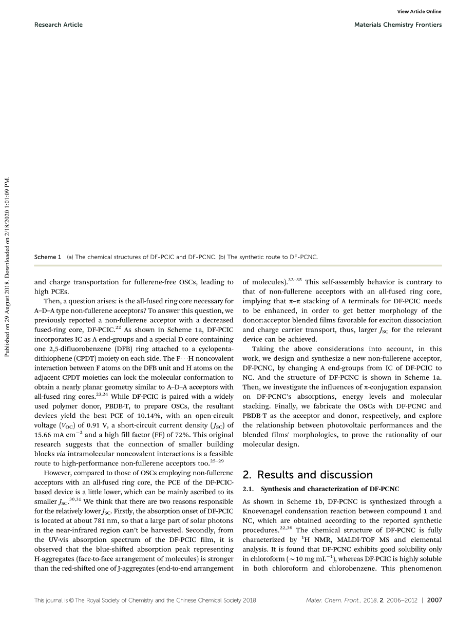 如方案1b所示,化合物1和端基通过Knoevenagel缩合反应合成DF-PCNC[22,36]。通过1H-NMR,MALDI-TOF MS和元素分析对DF-PCNC的化学结构进行了表征。发现DF-PCNC仅在氯仿中表现出良好的溶解性(~10 mg mL-1),而DF-PCIC则高度可溶于氯仿和氯苯中,这种现象意味着当A端基的结构从IC变为NC,DF-PCNC的分子间相互作用将变得更强。