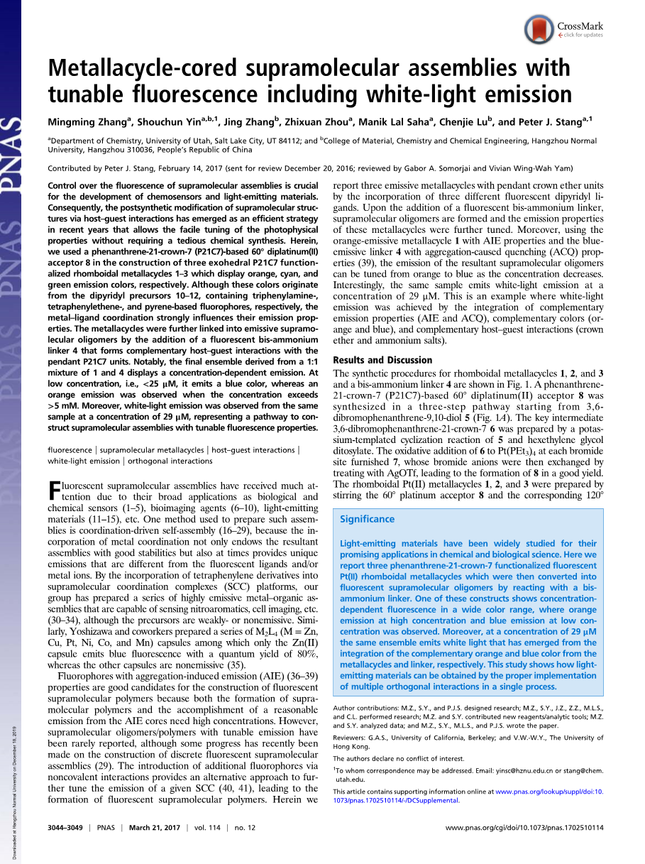 原文作者:Mingming Zhang, Shouchun Yin, Jing Zhang, Zhixuan Zhou, Manik Lal Saha, Chenjie Lu, and Peter J. Stang