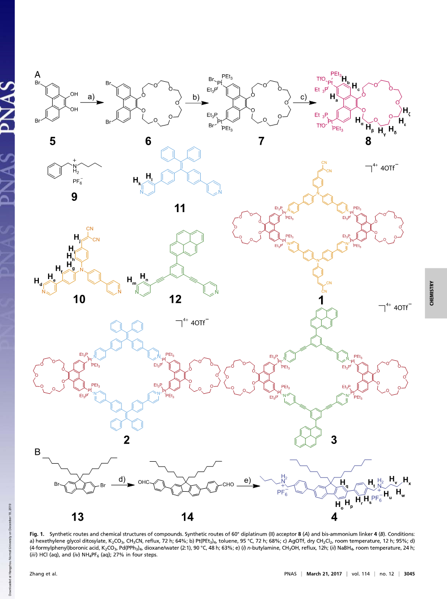 图1. 化合物的合成路线和化学结构。60°双铂(II)受体8(A)和双铵连接体4(B)的合成路线。条件:a) 己二酸己二醇酯,K2CO3,CH3CN,回流,72小时;64%;b) Pt(PEt3)4,甲苯,95 ℃,72小时;68%;c) AgOTf,超干CH2Cl2,室温,12小时;95%;d) (4-甲酰苯基)硼酸,K2CO3,Pd(PPh3)4,二恶烷/水(2:1),90 ℃,48小时;63%;e) (i) 正丁胺,CH3OH,回流,12小时;(ii) NaBH4,室温,24小时;(iii) HCl (aq);(iv) NH4PF6 (aq);27%,分四步进行