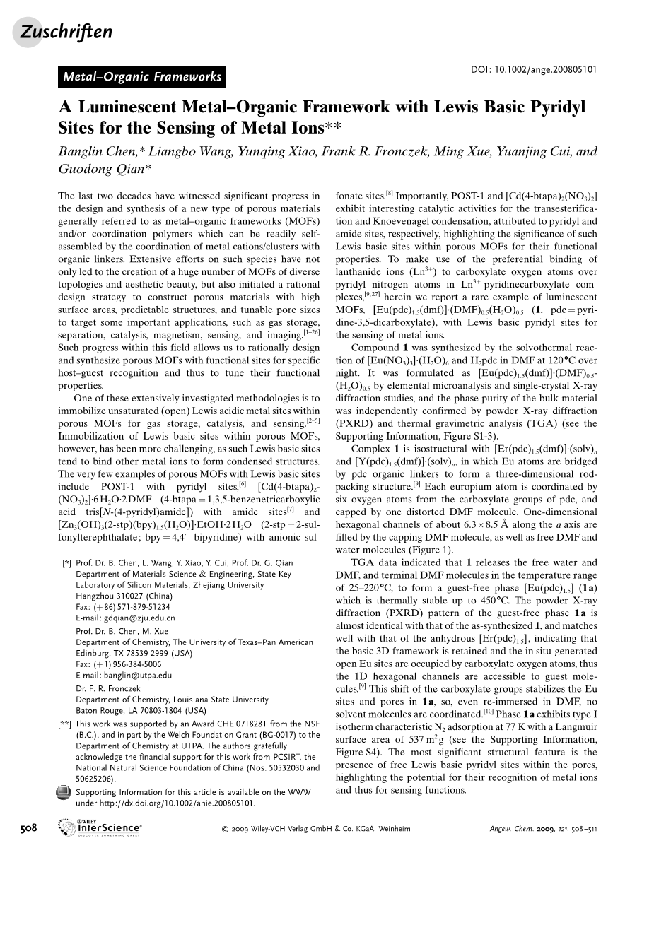 其中一种被广泛应用研究的方法是在多孔MOFs内固定不饱和(开放)Lewis酸性金属位点,用于气体存储、催化和传感[2-5]。然而,在多孔MOFs中固定Lewis碱性位点具有更大的挑战性,因为这样的Lewis碱性位点往往会与其他金属离子结合形成缩合结构。具有Lewis碱性位点的多孔MOFs的极少数例子包括带有吡啶基位点的POST-1[6], [Cd(4-btapa)2(NO3)2]bull;6H2Obull;2DMF(4-btapa=1,3,5-苯三羧基)3 [N-(4-吡啶基)酰胺])的酰胺位点和[Zn3(OH)3(2-stp)(bpy)1.5(H2O)]-EtOH-2H2O (2-stp=2-sul-fonylterephthalate;bpy = 4,4-联吡啶)与酸性磺酸盐部位[7]。更重要是,POST-1和 [Cd(4-btapa)2(NO3)2]在酯交换反应和Knoevenagel缩合反应中表现出有趣的催化活性,这两种反应分别归因于吡啶和酰胺位点[8],突出了多孔MOFs中的Lewis碱位点对其功能性质的重要性。为了利用Ln3 -吡啶羧酸配合物中镧系离子(Ln3 )在吡啶氮原子上与羧酸氧原子的优先结合[9-27]。在此我们报道了一个罕见的MOFs发光例子,[Eu(pdc)1.5(dmf)]bull;(DMF) 0.5(H2O)0.5(1,pdc=吡啶-3,5-二羧酸酯),带有路易斯基吡啶位,可用于金属离子的传感。