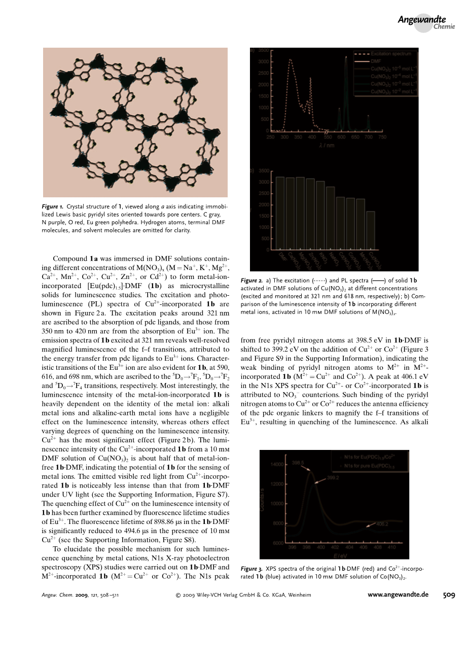 将化合物1a浸入不同浓度的M(NO3)x(M=Na 、K 、Mg2 、Ca2 、Mn2 、Co2 、Cu2 、Zn2 或Cd2 )的DMF溶液中,形成金属离子结合的[Eu(pdc)1.5]bull;DMF (1b)作为发光研究的微晶固体。Cu2 掺杂1b的激发和光致发光光谱如图2a所示。321 nm左右的激发峰为pdc配体的吸收峰,350 ~ 420 nm的激发峰为Eu3 离子的吸收峰。1b在321 nm激发下的发射光谱显示了f-f跃迁的良好分辨放大发光,这归因于从pdc配体到Eu3 离子的能量转移。1b的Eu3 离子在590、616和698 nm处也有明显的特征跃迁,这分别归因于5D0→7F1、5D0→7F2和5D0→7F4跃迁。最有趣的是,加入金属离子的1b的发光强度在很大程度上依赖于金属离子的同一性:碱金属离子和碱土金属离子对发光强度的影响很小,而其他金属离子对发光强度的猝灭程度不同。Cu2 的作用最为显著(图2b)。Cu2 在10 mM的Cu(NO3)2 DMF溶液中,加入的1b约为不含金属离子的1bbull;DMF的一半,表明1b对金属离子的传感潜力。Cu2 在紫外光照射下,结合的1b的强度明显低于1bbull;DMF(支持信息见图S7)。通过对Eu3 荧光寿命的研究,进一步考察了Cu2 对1b荧光强度的猝灭效应。在10 mM Cu2 存在下,1bbull;DMF中898.86 micro;s的荧光寿命显著缩短至494.6 micro;s(支持信息见图S8)。为了阐明金属离子致荧光猝灭的可能机理,利用N1s X射线光电子能谱(XPS)对1b (M2 = Cu2 或Co2 )进行了研究。N1s 峰值随着Cu2 或Co2 的加入,在1bbull;DMF中398.5 eV处的吡啶基氮原子转移到399.2 eV(支持信息见图3和图S9),表明M2 在M2 结合的1b (M2 = Cu2 或Co2 )中吡啶基氮原子与M2 的结合较弱。Cu2 -或Co2 -结合的1b在N1s XPS谱中有一个406.1 eV的峰属于NO3–反离子。这种吡啶氮原子与Cu2 或Co2 的结合降低了pdc有机连接器的天线效率,放大了Eu3 的f-f跃迁,导致发光猝灭。作为碱和碱性金属离子不与吡啶基氮原子结合,它们对发光的影响可以忽略。