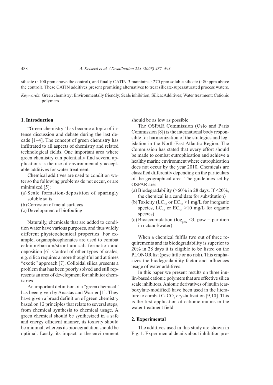 在本文中,我们提出了三种基于菊粉的阳离子聚合物的测试结果,这些聚合物是有效的二氧化硅垢抑制剂。在文献中已经有使用羧酸酯改性的菊粉阴离子衍生物来阻止CaCO3结晶的先例[9,10]。这是水处理领域中阳离子菊粉的第一次应用。