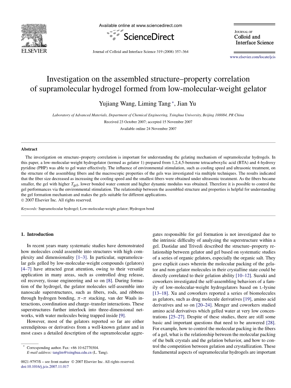 【摘要】超分子水凝胶的结构与性能关系的研究对于理解超分子水凝胶的凝胶原理是十分重要的。在本文中,由1,2,4,5-BTA和4-PHP制备出的一个低分子量的水性凝胶体(称作凝胶因子1)能够有效地水凝胶化。冷却速度和超声波处理对组装纤维结构和凝胶的宏观特性等环境刺激的影响已通过多种技术有所研究。结果表明,纤维尺寸随着冷却速度的增加而减小,当用超声波进行处理时,可以得到最小尺寸的纤维。 随着纤维尺寸越来越小,凝胶会有更高的凝胶溶解温度,更低的粘结水含量和较的高动态模量。 因此,可以通过环境的影响来改进凝胶的性能。 对于理解凝胶的形成机理,组织结构和性能之间的关系的研究是有用的,这可以使凝胶适用于不同的应用领域