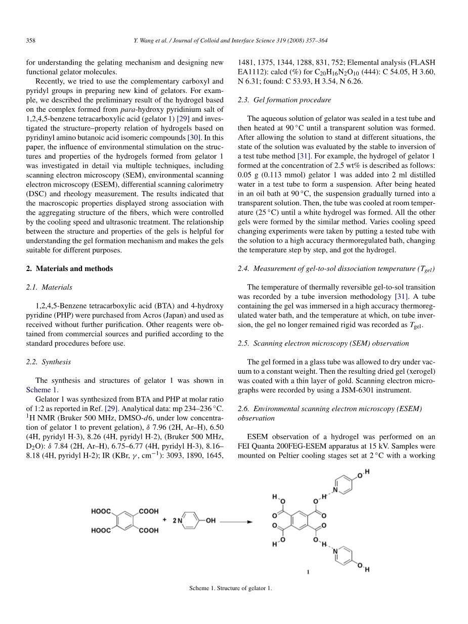 最近,我们尝试使用互补的羧基和吡啶基来制备新型凝胶。例如,我们描述了由1,2,4,5-苯四羧酸(记为小分子1)的对羟基吡啶盐形成的络合物的水凝胶的初步结果,并研究了基于吡啶基的水凝胶的结构-性质关系。本文通过扫描电子显微镜(SEM),环境扫描电子显微镜(ESEM),差示扫描量热法(DSC)和流变学测量等多种技术,详细研究了环氧化对小分子1形成的水凝胶的结构和性能的影响。结果表明,宏观特性与冷却速度和超声波处理控制的纤维聚集结构呈显着的强相关关系。凝胶的结构和性质之间的关系有助于理解凝胶的形成机理,使凝胶适合于不同的应用领域。