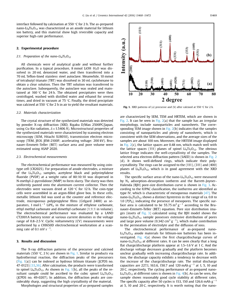 前体和煅烧材料的X射线衍射图(550℃,2小时)如图1所示。与通过水热反应的产物相似,前体的衍射峰(图1(a))可以被指定为含水钛酸锂(JCPDS no.47-0123)[33];[36]。 煅烧后,将产物转化为尖晶石Li4Ti5O12。如图1(b)所示,所得样品的所有峰均可归因于立方尖晶石Li4Ti5O12(JCPDS No.49-0207)。此外,衍射峰相当锐利,表明材料的高结晶度。