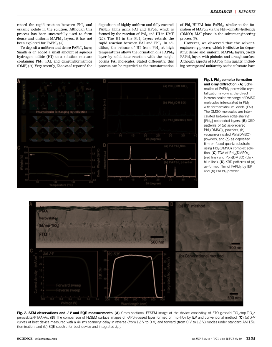 FAPbI3钙钛矿的带隙令其比常规的MAPbI3对太阳光谱的吸收范围更大。由于钙钛矿薄膜的光电性能与薄膜质量紧密相关,沉积致密而均匀的薄膜对制备高效钙钛矿太阳能电池是至关重要的。我们发现了一种沉积新的高效FAPbI3膜的方法,通过插入在PbI2中的二甲基亚砜(DMSO)分子与甲脒碘化物(FAI)之间直接进行分子内交换来促进FAPbI3结晶。该过程制备的FAPbI3薄膜沿(111)面优先生长,有大颗粒致密微观结构,有光滑的表面且没有剩余的PbI2存在.利用这种方法制备的薄膜,我们组装的FAPbI3基钙钛矿太阳能电池的光电转换效率能达到20%以上。