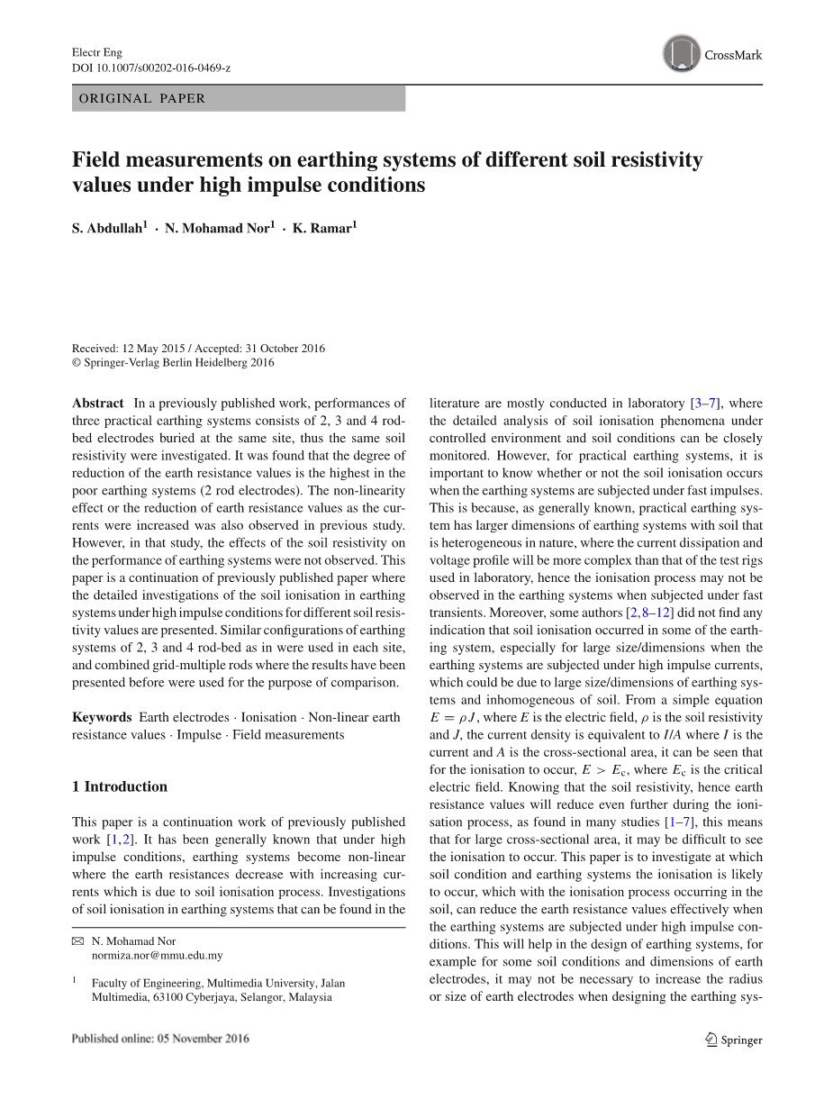 本文是对以前结果的进一步深入研究。已知在高脉冲条件下,由于土壤的电离,接地系统属于非线性系统,其接地电阻随着测量电流的增加而减小。在文献中,对接地系统中的土壤电离现象的实验主要在实验室中可控的环境下进行,这样就能对电离现象进行准确的检测。但是对于实际的接地系统,在当接地系统收到快速冲击时,土壤是否发生电离这是很难判断的。这是因为实际的接地系统是较大的接地系统,而土壤却不是均匀的,其中电流耗散和电压分布的情况将比实验室中试验台的情况更加复杂,因此在快速变化条件下,电离过程或许很难被探测到。此外研究人员并没有找到任何证据表明在某些接地系统中土壤会发生电离,特别是当接地系统接受大电流冲击时,土壤是否电离就更难确定,这可能是由于大尺寸接地系统和土壤的不均匀性造成的。从一个简单的方程看,E = rho; J,其中E是电场强度,rho;是土壤电阻率,J是电流密度,而J又等于I/A,其中I是电流,A是横截面积,可以看出对于电离发生时,Egt;Ec,其中Ec是临界电场。在许多研究中发现,在电离过程中,接地电阻值会随着电离程度的加深进一步降低,这意味着对于大面积的接地电网,可难很难观测到电离的发生。本文旨在研究哪些土壤条件和接地系统可能发生电离,当接地系统受到高冲击影响时,随着土壤中电离的发生,接地电阻可以得到进一步的降低。这将有助于设计接地系统,在不同土壤条件和不同接地电极尺寸的情况下,可能不需要增加接地电极的半径或者尺寸,因为接地系统中,接地电阻会随着土壤电离程度的加深而“自然”的降低。此外,一般来说,接地系统尺寸的增加将会改变接地系统的对瞬态变化的感应效应,盲目的增大接地系统的尺寸将会使接地系统的有效性降低。因此,本研究课题对于接地系统设计工程师在设计中了解和考虑土壤的电离过程是十分重要的。