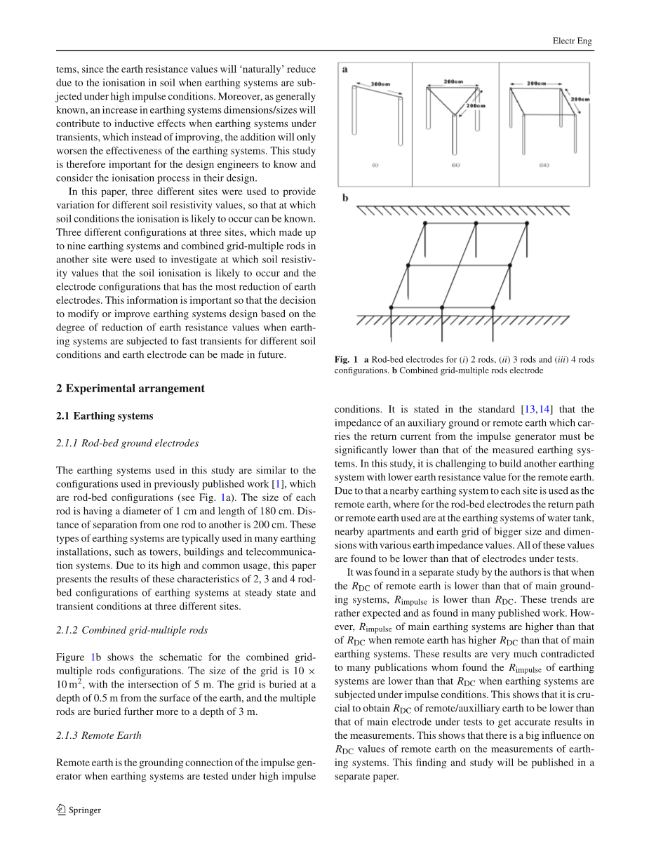 本研究中所使用的接地系统与之前发表在论文中使用的接地系统类似,都是使用棒状电极(见图1a)。每个杆的尺寸的直径为1厘米,长度为180厘米。杆与杆之间的距离为200厘米。这种类型的接地系统被经常使用,例如塔,建筑物和电信系统的接地系统,都是这种接地系统。由于其使用的广泛性,本文介绍了三个不同位置的稳态和瞬态的条件下,接地系统的2,3和4极法测量结果的特点。