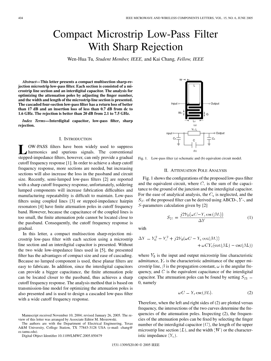 [5] J.-T. Kuo and J. Shen, “A compact distributed low-pass filter with wide stopband,” in Proc. Asia-Pacific Microwave Conf., vol. 1, 2001, pp. 330–333.