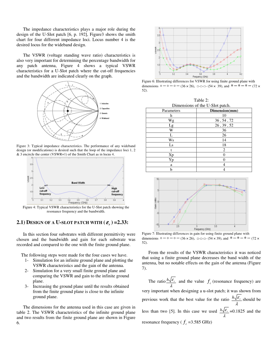 本文主要分为两部分;第一部分描述了测试增加有限地平面尺寸对U型槽微带天线的影响。第二部分描述了一种增加天线带宽的新技术。在第2节中,注意到对于使用有限地平面,带宽比理想情况(无限地平面)减小,但增益有很大的视觉变化。随着有限地平面的尺寸增加,带宽百分比增加。值得注意的是,随着介电常数(εr)的增加,带宽接近理想情况的有限地平面增加,这意味着当εr= 2.33时,有限地平面小于使用εr= 3.27。