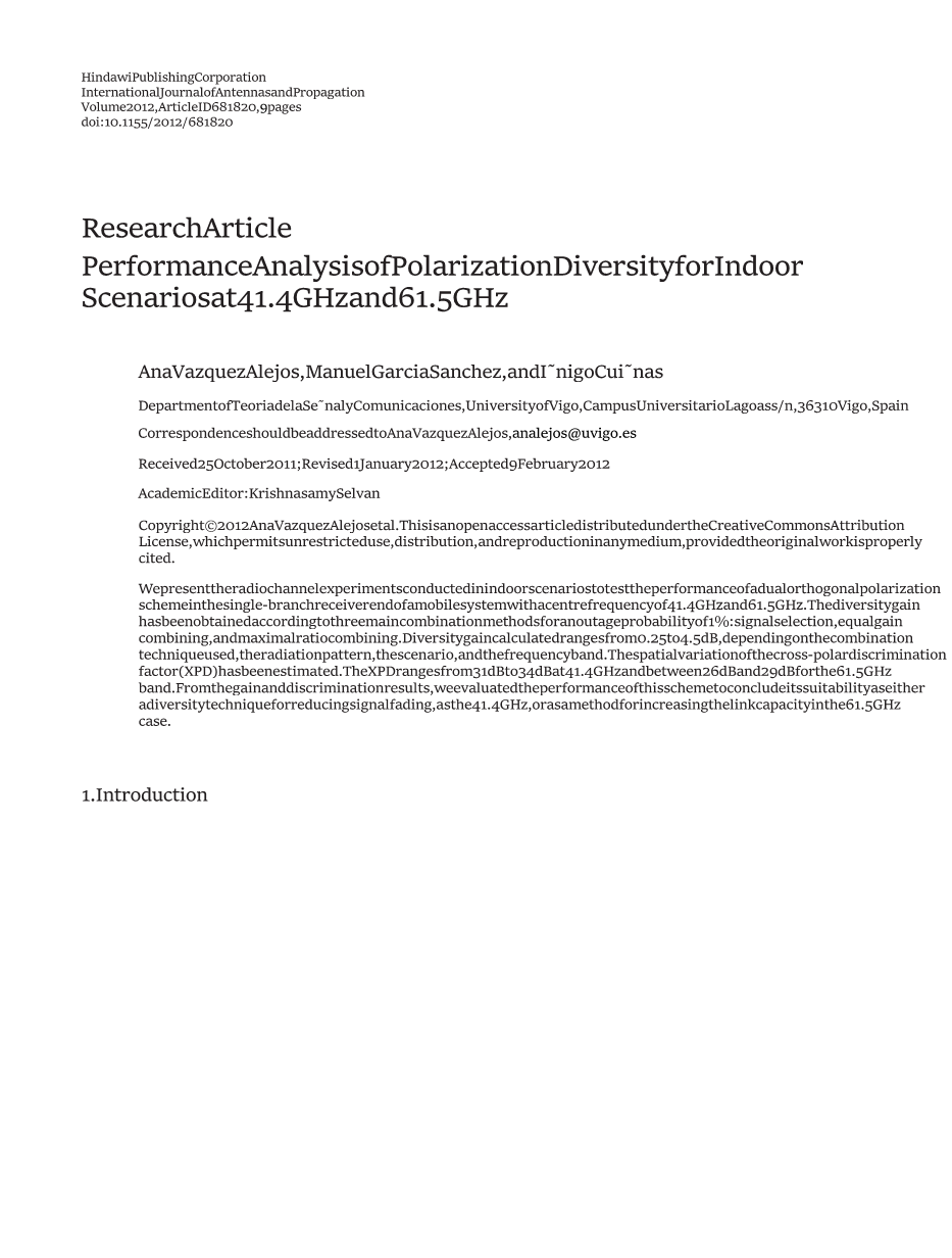 DepartmentofTeoriadelaSe~nalyComunicaciones,UniversityofVigo,CampusUniversitarioLagoass / N,36310Vigo,西班牙 CorrespondenceshouldbeaddressedtoAnaVazquezAlejos,analejos @ uvigo.es Received25October2011;Revised1January2012;Accepted9February2012