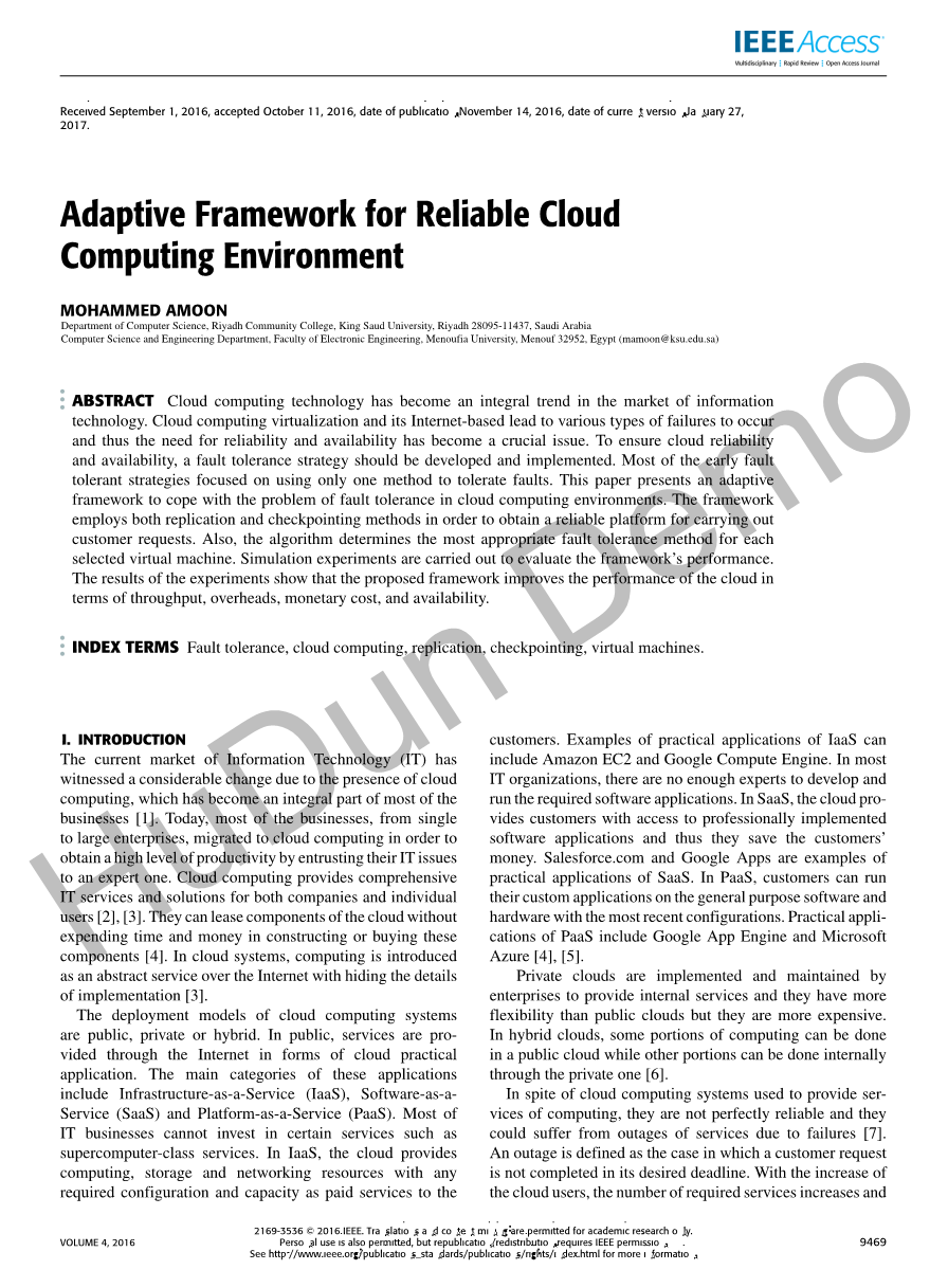 云的动态行为增加了故障的概率。为了避免或减少这些故障的影响,云应该应用容错,其可以是被动的或主动的。应用被动的容错方法以便最小化或略去对货币和时间成本的影响。复制和检查点是两种常用的反应方法。