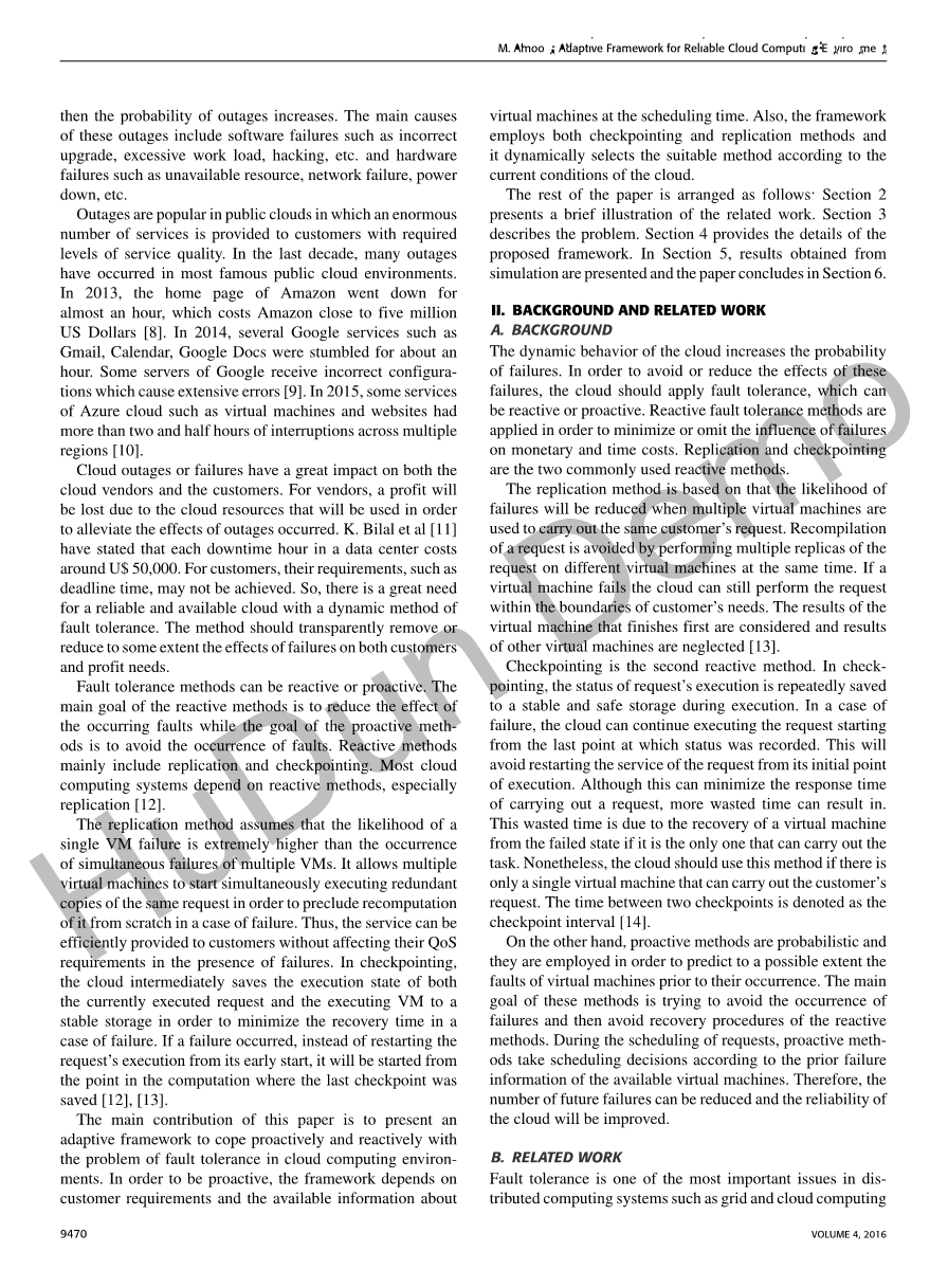 2012年,Zheng et al提出了一种可以为每个虚拟机选择容错方法的算法。算法可以选择的所有方法是复制方法的变体,例如并行和多流程。2015年,Saranyaetal提出并评估了一种基于复制和重新提交任务的方法。 他们的方法取决于每个任务的优先级,取决于任务的长度,截止时间和每个任务的超出程度.2015年,Liuand Wei提出了基于复杂的算法,考虑硬件和软件的故障。