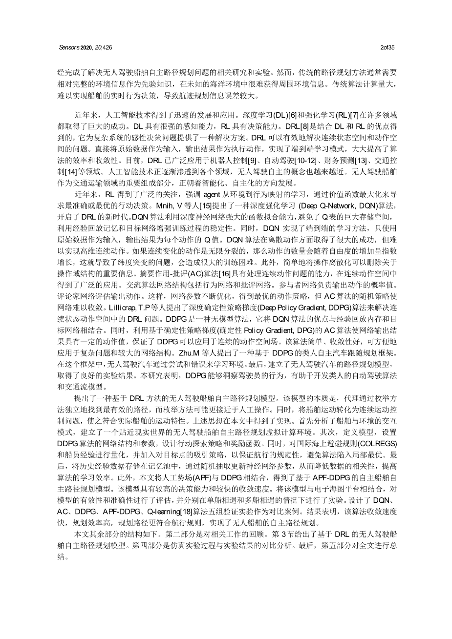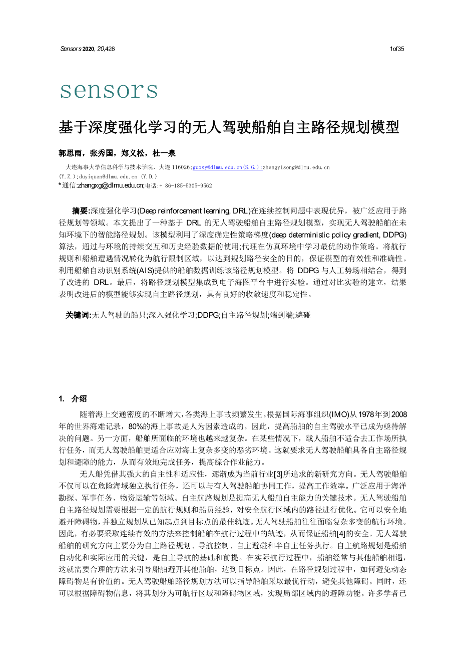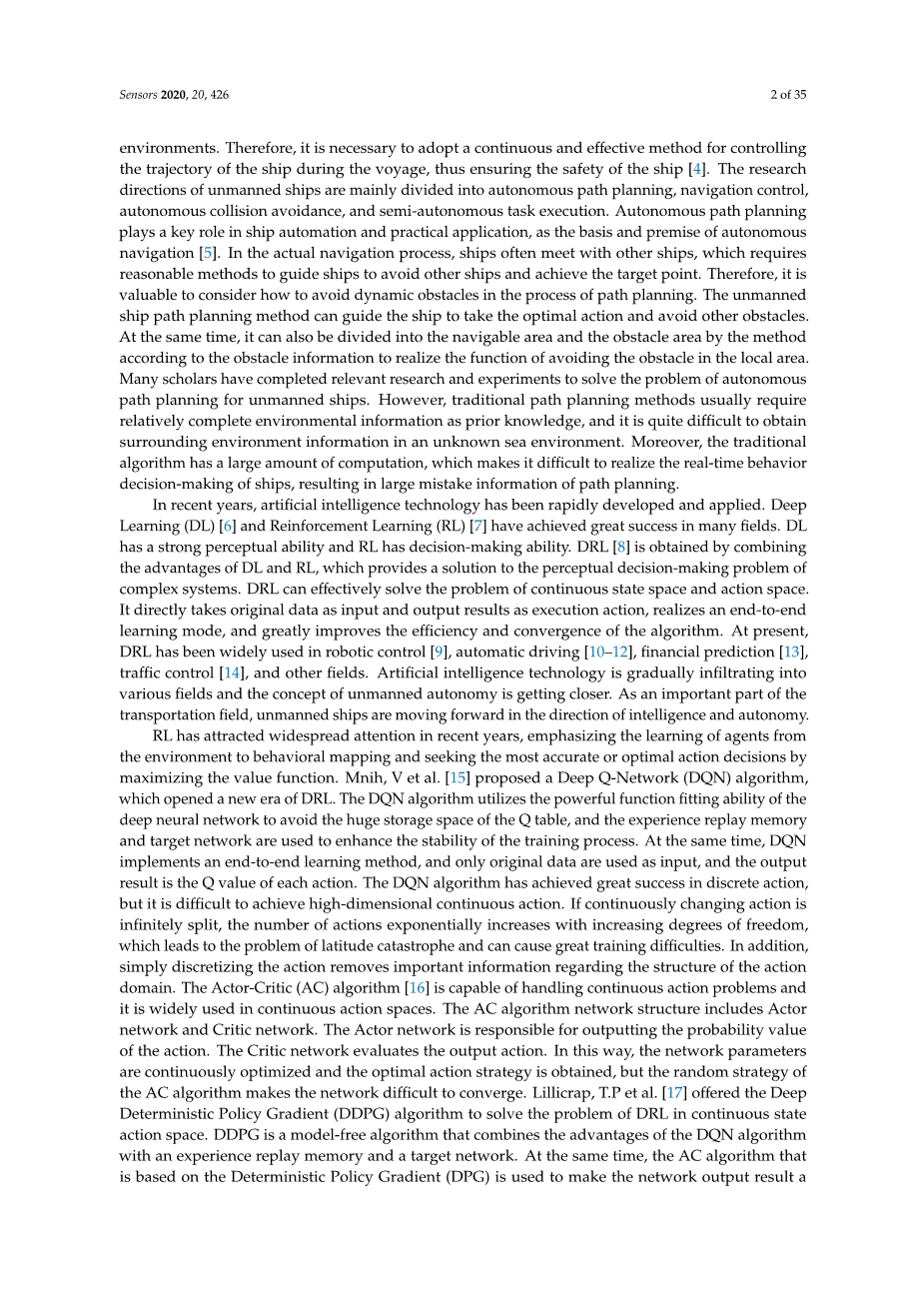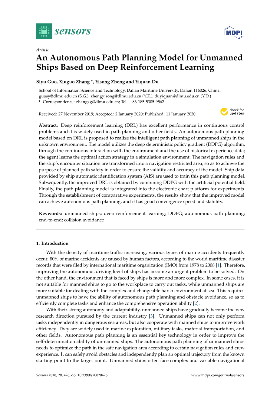 基于深度强化学习的无人驾驶船舶自主路径规划模型外文翻译资料 2023-01-16 09:32:22 英语原文共 35 页,剩余内容已隐藏,支付完成后下载完整资料 英语译文共 32 页,剩余内容已隐藏,支付完成后下载完整资料 资料编号:[239387],资料为PDF文档或Word文档,PDF文档可免费转换为Word 您需要先支付 30元 才能查看全部内容!立即支付 发小红书推广免费获取该资料资格。点击链接进入获取推广文案即可: Ai一键组稿 | 降AI率 | 降重复率 | 论文一键排版 PREVIOUS NEXT 您可能感兴趣的文章 基于FPGA建模实现2FSK的调制与解调设计开题报告 基于无线通信技术的家庭门铃系统程序设计文献综述 基于单片机的心率测试系统开题报告 WR-4频段E-面波导功分器的设计研究文献综述 水情智能感知和控制系统在智慧城市中的应用文献综述 基于图像处理技术的位移测量系统文献综述 基于视频的人脸表情识别算法研究与系统设计文献综述 线极化与圆极化可重构天线的设计与研究开题报告 基于视频监控的人跌倒行为识别的编程实现文献综述 基于Unity3D引擎的射击游戏设计与实现文献综述