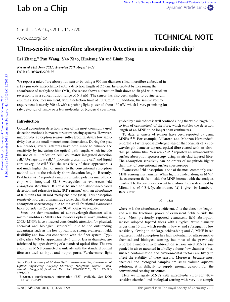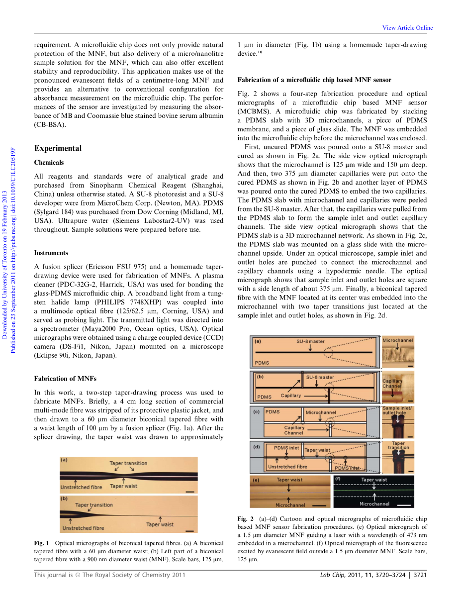 在这里,我们将微纳光纤与微流控芯片结合,用于具有极小量样品需求的超敏感化学和生物检测。微流控芯片不仅为微纳光纤提供自然保护,而且还能提供用于微纳光纤的的微/纳米级样品溶液,它还可以保证优异的稳定性和重复性。该应用使用了一厘米长的微纳光纤的明显的消逝场,并且提供了用于微流控芯片上的吸光度测量的常规配置的替代方案。 通过测量亚甲基蓝(MB)和考马斯蓝染色的牛血清白蛋白(CB-BSA)的吸光度来研究传感器的性能。