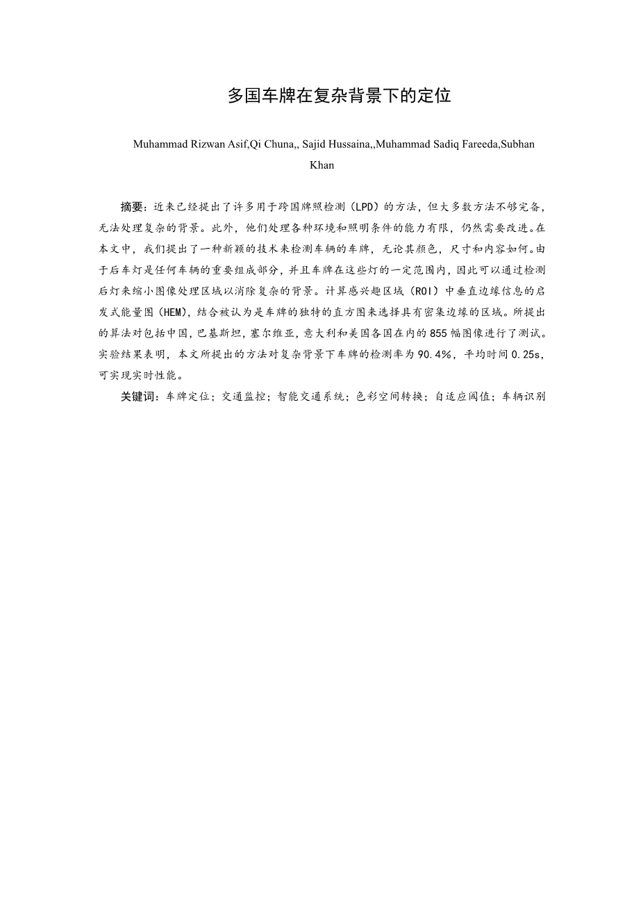 多国车牌在复杂背景下的定位外文翻译资料 2023-02-27 09:14:21 英语原文共 11 页,剩余内容已隐藏,支付完成后下载完整资料 英语译文共 22 页,剩余内容已隐藏,支付完成后下载完整资料 资料编号:[26660],资料为PDF文档或Word文档,PDF文档可免费转换为Word 您需要先支付 30元 才能查看全部内容!立即支付 发小红书推广免费获取该资料资格。点击链接进入获取推广文案即可: Ai一键组稿 | 降AI率 | 降重复率 | 论文一键排版 PREVIOUS NEXT 您可能感兴趣的文章 基于FPGA建模实现2FSK的调制与解调设计开题报告 基于无线通信技术的家庭门铃系统程序设计文献综述 基于单片机的心率测试系统开题报告 WR-4频段E-面波导功分器的设计研究文献综述 水情智能感知和控制系统在智慧城市中的应用文献综述 基于图像处理技术的位移测量系统文献综述 基于视频的人脸表情识别算法研究与系统设计文献综述 线极化与圆极化可重构天线的设计与研究开题报告 基于视频监控的人跌倒行为识别的编程实现文献综述 基于Unity3D引擎的射击游戏设计与实现文献综述