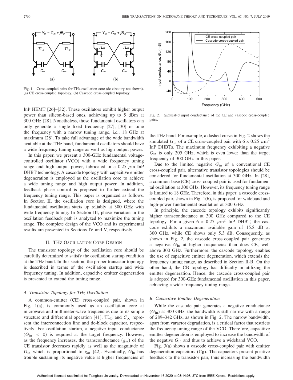 共发射极(CE)交叉耦合对,如图1所示。1(a),由于其简单的结构和差分操作,通常用作微波和毫米波频率的振荡核心[41]。TLB和C分别代表互连线和隔直电容器。对于振荡启动,在目标频率下需要负输入电导随着频率的增加,CE晶体管的跨导(Gm )以及与Gm[42]成比例的G在中的大小迅速降低。最终,G在中在较高频率下难以维持其负值