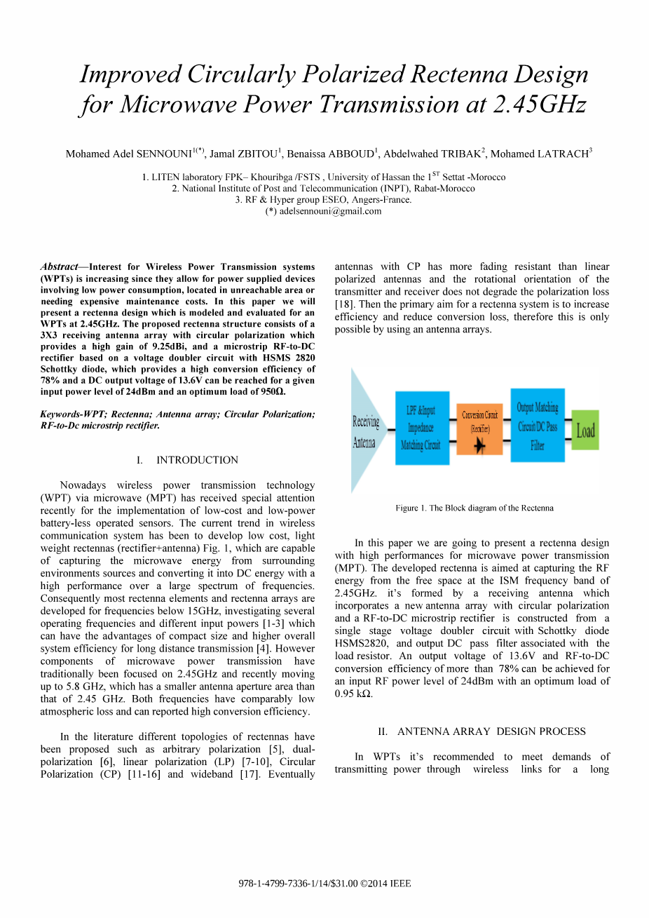 摘要-自从电力供应问题涉及到低功耗,位于不可抵达的地方或者维护成本很高的装备,人们对无限能量传输系统的兴趣越来越大。本篇论文我们将展示一款为基于2.45GHz能量收集系统建模设计的天线。拟建天线系统包含一个3X3增益高达9.25dBi的接收天线阵,以及一个使用HSMS 2820肖特基二极管的二倍压整流电路,该整流电路提供了达78%的整流效率,直流输出有13.6V,在最佳负载950欧时可以提供24dBm的输出能量。