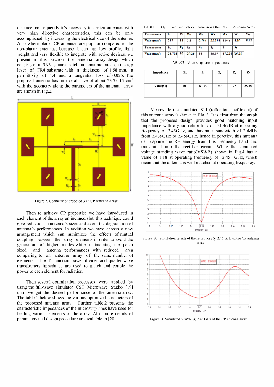 在天线应用中,有必要设计具有很高指令特性的天线,以满足长距离链路的需求。由于目的是使用整流天线通过无线链路长距离传输直流电力,这只能通过增加天线的电气尺寸来实现。我们在本节介绍天线阵列设计,其中包括在FR4基板上蚀刻的3X3方形贴片天线( = 4.4,厚度= 1.58 mm,= 0.025),我们已经应用了两种方法,第一个是中心的倾斜槽以获得圆极化,我们选择了这种技术,以避免天线尺寸的增加或修改,第二个是每个天线的核心处的V形槽为了提高2.45GHz的工作频率带宽,图2显示了天线阵列的几何形状,这种新的布置可以最大程度地减少阵列元件之间的互耦作用,并避免产生更高的模式;可以占用相同数量的元件的这种天线阵列的减小的面积。我们精湛地优化了天线尺寸,并且使得天线阵列结构具有2.45 GHz的谐振频率。 使用全波模拟器CST Microwave Studio进行优化。下面的表1显示了所提出的天线阵列的各种优化参数。 此外,用于馈送阵列的各种元件的微带线的特征阻抗如表2所示。