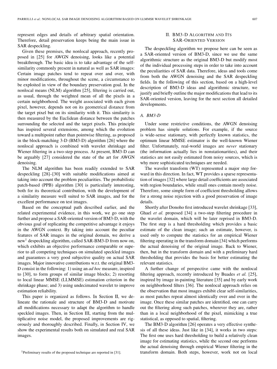 一些早期的去斑点技术(在[2]和[3])用所谓的同态方法,取数据的对数,以获得一个易于处理的模型,然后用一些众所周知的方法来去除加性高斯白噪声。即使这种方法有着优越的简便性优点,但是它是次优的,因为它忽略了斑点的基本特征。事实上,对数变换后的斑点是非高斯的,从单一例子来看很显然[4],有着非零均值,一般来说,在任何进程前都有有偏差值。更重要的是,这个算法改变了数据的动态性,导致了在去噪过程中不可避免的有放射性畸变。在同一时期,在原始域中有更多伟大的技术来去除斑点[5]-[10](非对数变换),作为一个数据估计问题,基于模拟斑点模型。所有这些方法都是在空间域的线性发展下的一个最小均值方差方法。这些早期的文献已经很清晰的看出,一些局部自适应方法对图像的非平稳有影响。强度的光滑需要减少在均匀区域的斑点,而不能应用于边缘,这样会让重要的图像结构信息丢失。在[11]-[13]中,简单的 MMSE 被替换成一个更有经验的或是有前途的后验值方法。然而,用这个方法可以提供一个精确的数据来描述 SAR 图像。在 1990 年代早期,在信号处理中小波的扩散开辟了一个新一代在变换域中去斑点技术的方法,确实,基于 AWGN 假设的小波收缩图像去噪,曾经是第一个也是最成功的一个在变换中的应用。小波收缩可以被应用于 SAR 图像去斑点中,在一个同态变换后,导致一个加性噪声模型。这种方法在[14],[15]中也有,都是经过硬阈值和软阈值检测的。尽管是有经验的阈值选择,实验,在所有合成图像和真实 SAR 图像都表现出一个清晰的好于 w.r.t 空间域自适应的滤波。可以通过一个数据贝叶斯方法[16]-[18]来选择收缩系数以达到更好的效果。最后,就像在空间域,更多的复杂技术[19]-[22]凭借加性独立信号斑点模型来克服同态方法的缺点。所有这些基于小波的技术,像分类技术,体现为一些空间相适应,在滤波进程中可以得到更好的边缘和结构。这个也清晰的表述在最近的文献中[23],[24],凭借第二代小波技术来得到更好的图像边缘和任意方向的细节。因此,细节保留是 SAR 图像去斑点中的主要问题。所给的这些前提,非局部方法,最近被用于 AWGN 去噪,就像是潜在的重大突破。基本的思想是利用自然图像和 SAR 图像中所呈现的自相似性:某些图像补丁不停的重复一些微小的修改,贯穿整个图像,来达到保留图像边界的目的。在非局部算法中[25],像往常一样要进行滤波,在一个特定邻域中算出所有像素的权值。这个权值,和所有给出的像素有关,然而不取决于和目标像素的几何距离,而是取决于他们的相似性。这种相似性是在目标像素和选中的像素之间的欧氏距离所测量的。这个原则有几个扩展,演化成一个多点的滤波,就是所提到的 BM3D算法[26].BM3D算法是非局部方法,结合了小波收缩和维纳滤波的一个 2步进程。现在 BM3D 被论证为去除 AWGN 最好的方法。非局部算法已经扩展为为 SAR 图像去除斑点[28]-[30],有一些适当的修改来考虑到问题的独特性。PPB 算法[30]尤其有意思,不管是理论贡献,有针对 SAR图像的相似性度量的改进,也有测试图像卓越的表现。基于早些的概念路径和有关的实验证据,在这次工作中我们将进一步的基于BM3D 算法对 SAR图像去噪处理。在AWGN噪声的环境中,BM3D有着明显的优越性。考虑到 SAR 图像在原始域中的特有特征,我们有一种新的去斑点算法,从现在其称为 SAR-BM3-D 算法,展示了一个很有效的或更有竞争力基于模拟斑点图像去噪技术,以保证在真实 SAR 图像上有一个很好的图像质量。主要的革新创举在原始BM3D 包含如下:1)用一个 ad hoc 测量方法,在[30],用于群组相似图像块;2)在收缩阶段凭借局部线性 MMSE 估计;3)用非抽样小波来提高估计真实性。本文结构如下。在第二部分,介绍 BM3D 的算法结构和为了处理斑点图像所作出的必要修改。在第三部分,用于乘法噪声模型,用所提到的严厉和彻底的描述改进。最后,在第四部分,给出实验中所有模拟的和真实的 SAR图像结果。
