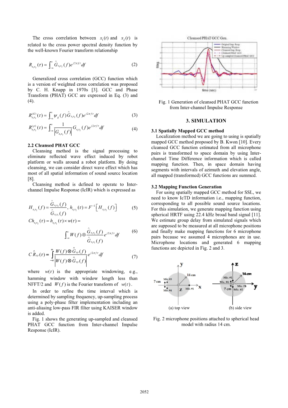 要使用空间映射GCC方法来进行SSL,我们需要知道IcTD信息,即映射函数,对应于所有可能的声源位置。对于该模拟,我们使用22.4kHz宽带信号产生的球形HRTF来产生映射函数[11]。