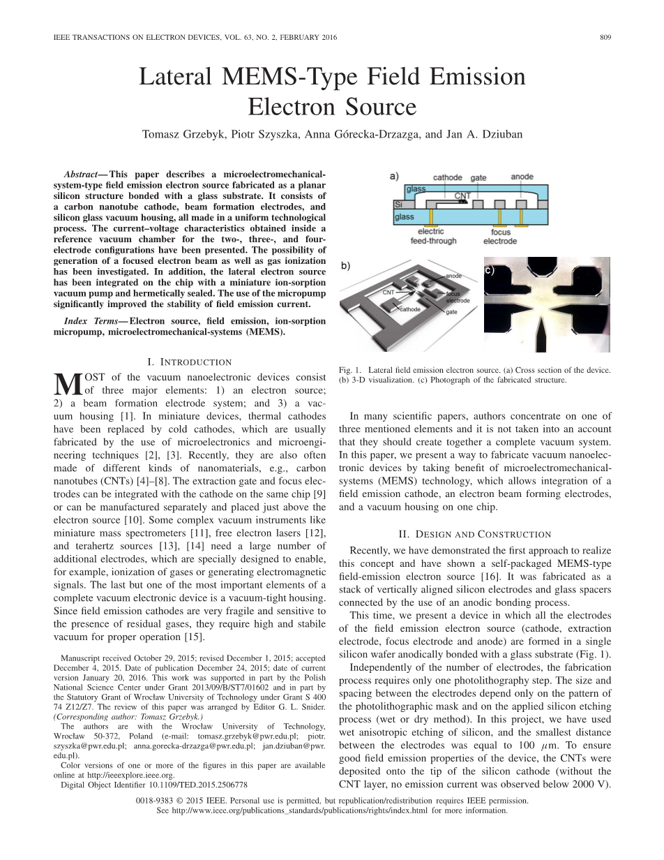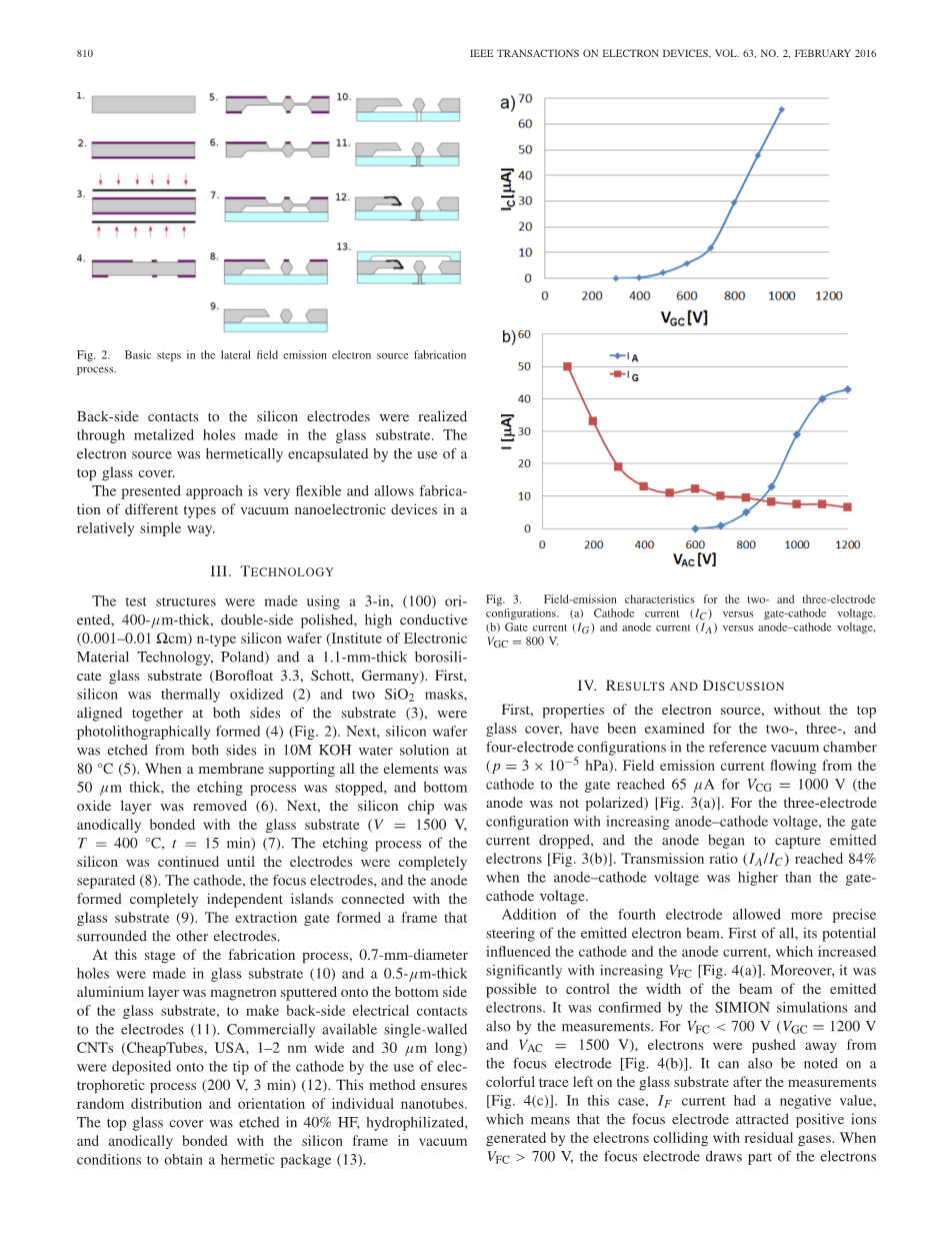 横向CNT场致发射电子源已使用MEMS技术制造。与之前报道的结构相比,有一些积极的和消极的方面。工艺过程稍微复杂一些(例如,制作电馈通的必要性),但另一方面更具可扩展性。技术复杂性对于具有两个和十个电极的结构是相同的。单个电极的排列和多阳极键合过程也不存在问题,因为它在垂直源中。