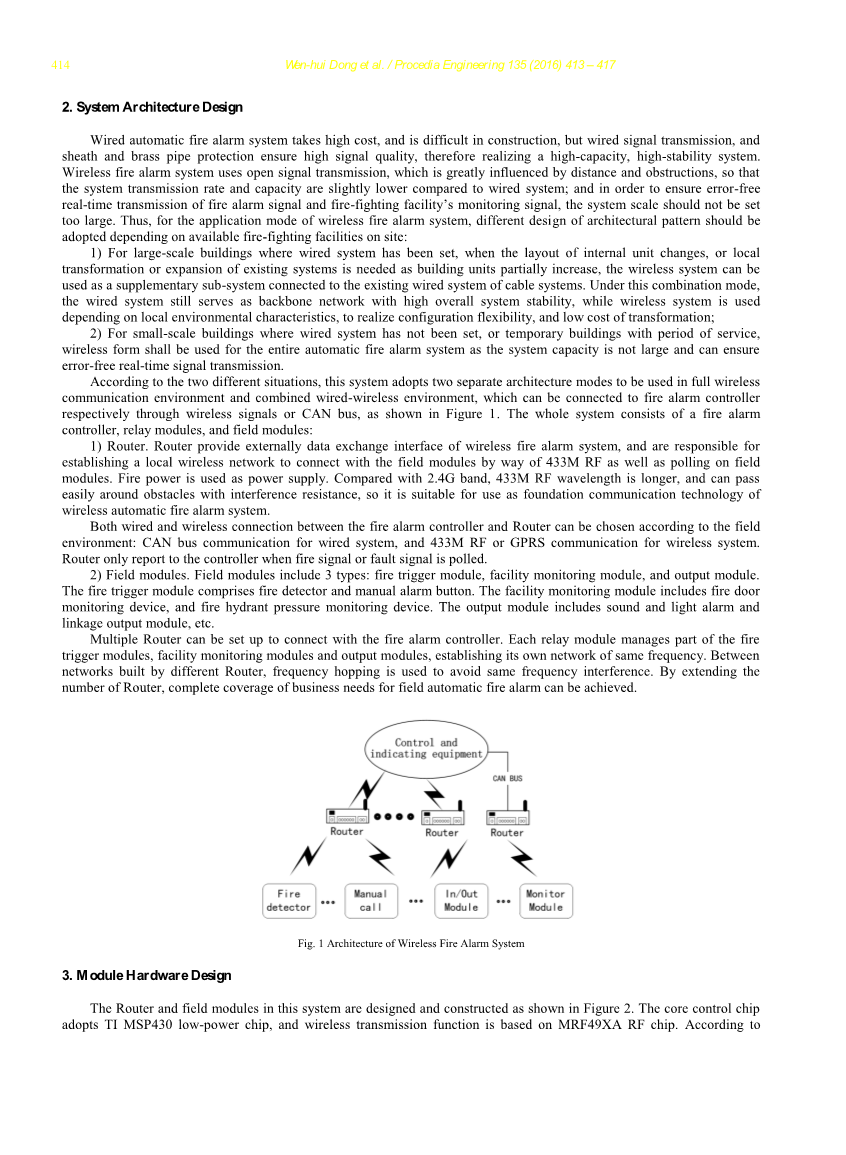 总之,分析自动火警系统设定的特征,提出了无线433M火灾自动报警系统的建筑,设计和开发系统模块的硬件,以及设计的通信间隔插入轮询逻辑,可以有效地降低平均功耗基于分析和总结的无线火灾自动报警系统的通信行为特征,从而完成这个无线火灾报警系统的设计和开发。与2.4G通信技术相比,该系统使用433M的RF信号的波长的优点,具有较强的衍射能力。与其他低兆赫RF通信无线火灾报警网络相比,该系统具有潜在的有线系统集成度和低平均通信功耗,它的应用有利于提高3合1的地方,多产权临街店铺的消防安全水平,砖或木遗迹和古建筑,临时建筑等场所。