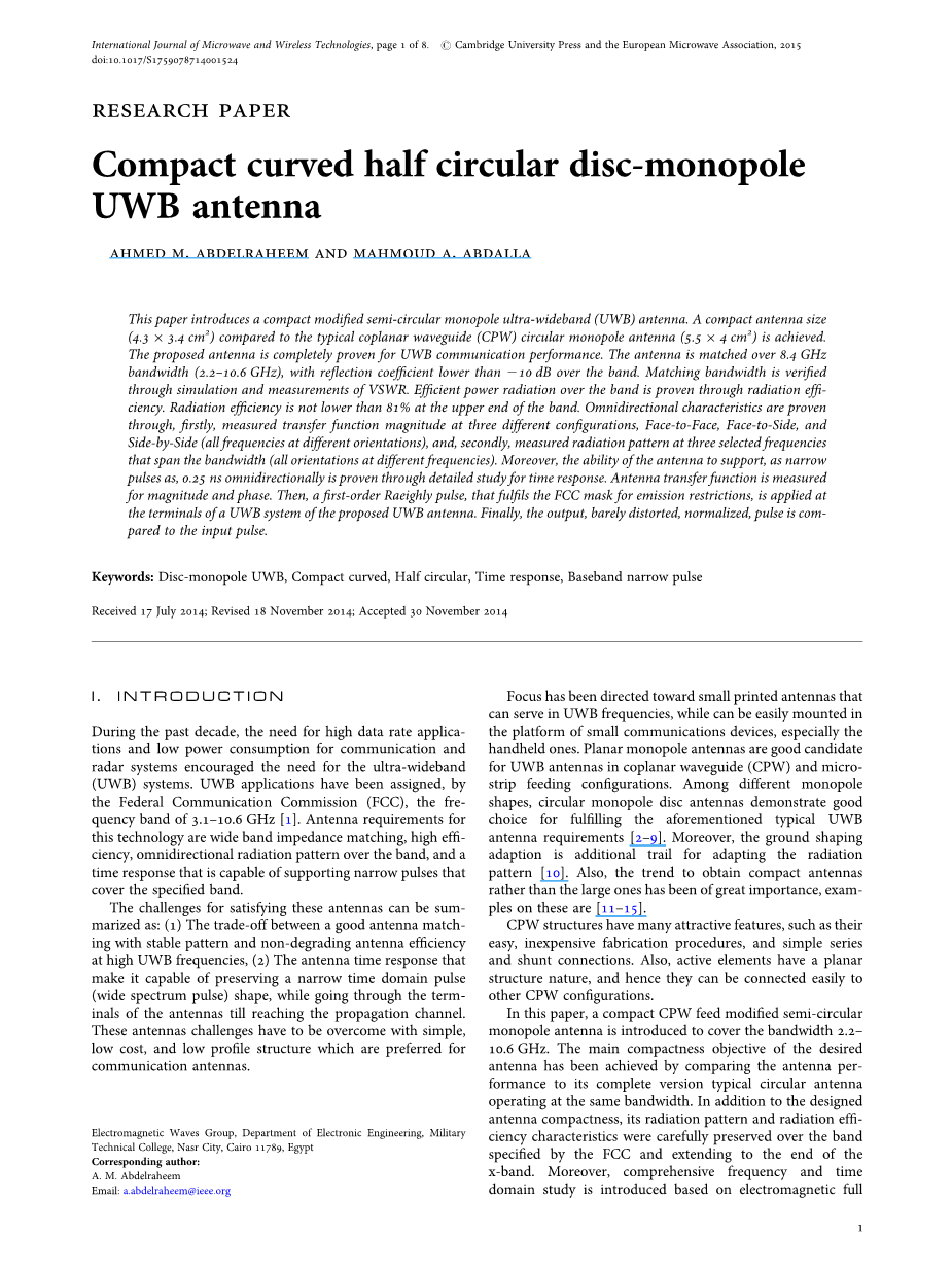关键词:光盘单极UWB,紧凑型弯曲,半圆形,时间响应,基带窄脉冲