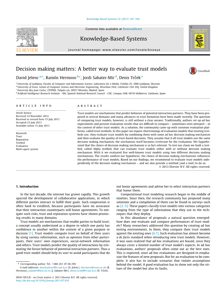 正如我们将在本文中所展示的那样,这种特殊配对可能是有问题的,因为一些决策机制可能更多适合某些信任模式,可能无法与其他人一起工作。例如,使用一个信任模型结合决策机制A可能会产生不同的情况结果比使用与决策机制B相同的信任模型。看起来像次要实施细节的东西可能完全摆脱评估结果。