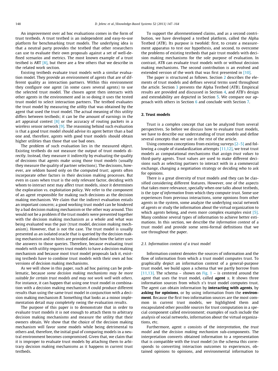 没有决策机制的信任模式是信任提供描述如何的规则,公式或算法的模型计算信任度,但同时也不提供任何指导关于如何在决策过程中使用该信息。这样信任模型是文学中最常见的。评估他们,我们必须给他们经验,为了创造这些经验,图。信托模式的信息背景。代理商Alpha使用信任模型,通过(i)与代理人进行交互来获取信息,(ii)询问代理人的意见,以及通过使用(iii)环境中的其他信息。然后,代理将所计算的信任值传递给其决策机制,并将它们用于各种决策制定流程,例如决定与谁进行互动或谁要求意见。D. Jelenc等/知识型系统52(2013)147-164 149有人必须选择互动伙伴。现有的测试台解决了这是通过将信任模型与特设决策机制配对。一个常见的例子是选择信任的代理模型分配了最高的信任度。如我们稍后所示(见第4节),这种配对可能是有问题的,因为某些决定制定机制可能更适合某些信任模型并且可能无法与其他人一起工作。