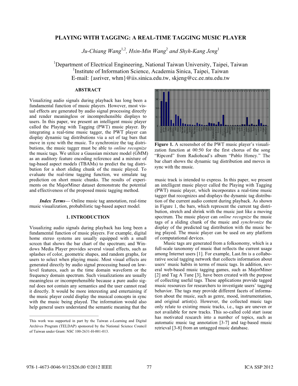达。在本文中,我们将介绍一款名为带标签播放(PWT)音乐播放器的智能音乐播放器,该播放器包含一个实时音乐标签器,可在播放过程中识别并显示当前音频内容的动态标签分布。如图1所示,表示当前标签分布的条形,就像移动光谱一样随着音乐伸缩。音乐播放器可以在线识别音乐的滑动块的音乐标签并且使预测标签分配的显示与正在播放的音乐同步。音乐播放器可用于任何计算设备平台。