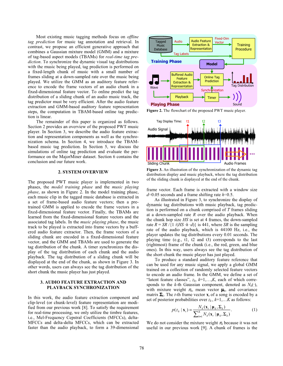 本文的其余部分安排如下。第2节概述了提议的PWT音乐播放器。 在第3节中,我们描述音频特征提取和表示组件以及同步模式。在第4节中,我们介绍基于TBAM的音乐标签预测。在第5节中,我们讨论在线标签预测的模拟并评估MajorMiner数据集的性能。第6节包含结论和我们未来的工作。