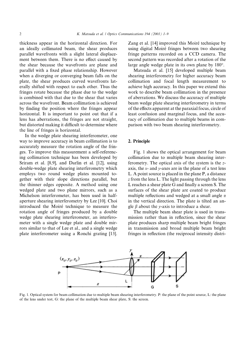 在楔形平板剪切干涉实验中,一种提高光束准直精确度的方法是提高干涉条纹旋转角的测量精度。为了提高测量精度,Sriram et al 和Darlin et al 发展了一种自准直技术,这种技术使用双面楔形平板剪切干涉即使用两块圆楔形平板,斜面方向平行,较薄的边缘相反地叠在一起。一种方法是采用一块楔形平板和两个平面镜,例如迈克尔逊干涉仪,这种方法已经在Lee的半孔径剪切干涉法中得到使用。Choi介绍了Moire方法来测量双楔平板剪切干涉实验的旋转角,和Lee实验类似的使用一块单楔平板及两面反射镜的干涉实验,和使用Ronchi光栅的单楔平板干涉实验中干涉条纹的旋转角。Zang et al 通过在CCD相机记录的两剪切干涉图条纹间使用数字Moire条纹进一步发展了Moire方法。第二个干涉图案是大角度楔形平板在其自身平面旋转180度后记录下的。