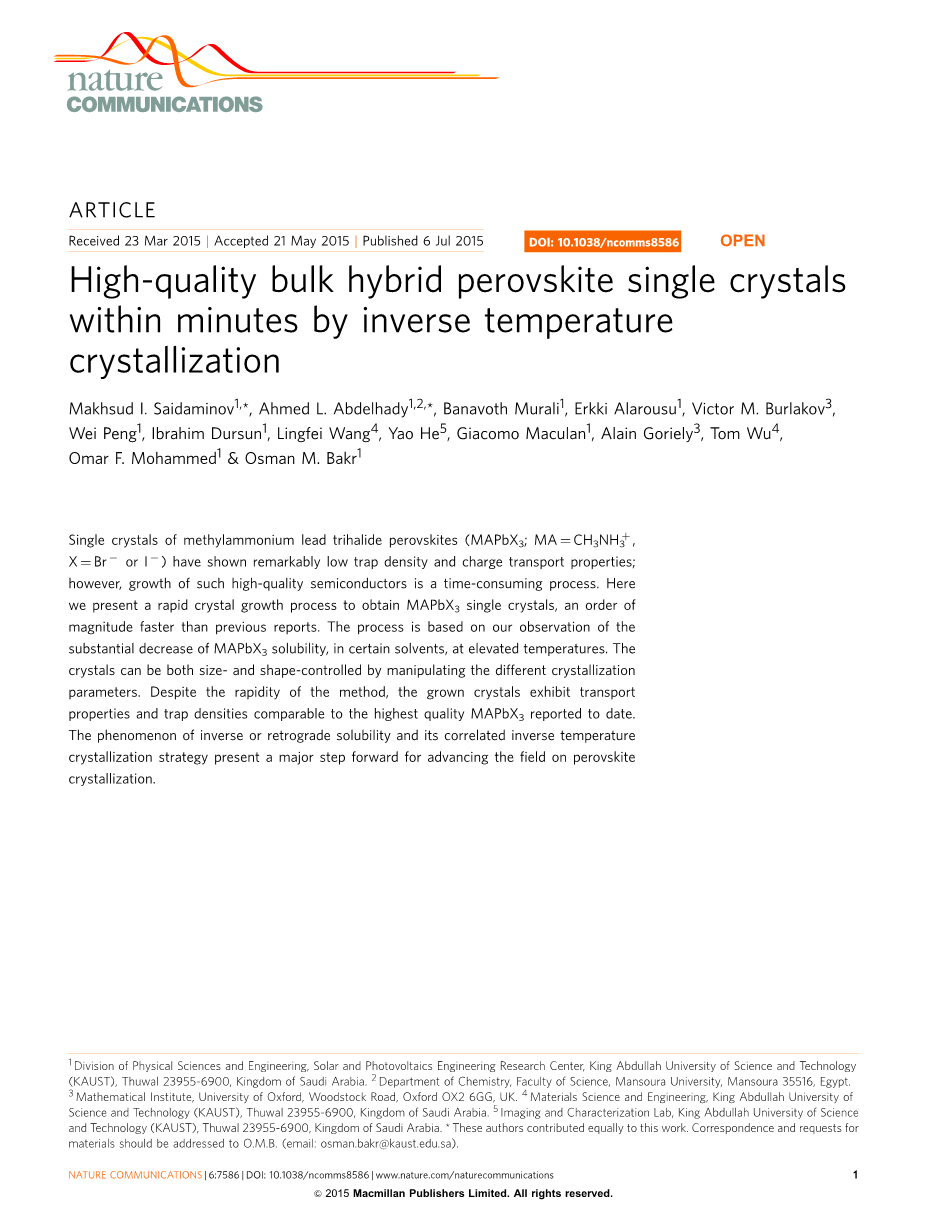 摘要:三卤化铵铅钙钛矿单晶(MAPbX3; MA=CH3NH3 ,X=Br -或I-)具有显著的低陷阱密度和电荷传输特性;然而,这种高品质的半导体的增长是一个耗时的过程。在这里,我们提出一个快速晶体生长过程中获得MAPbX3单晶体,比以前的报告快一个数量级。这个过程是基于我们对MAPbX3的观察,在一定的溶剂中,升高温度MAPbX3溶解度大幅下降。晶体可以通过对不同的结晶参数的操纵控制其大小和形状。尽管该方法具有较快的速度,但是报告晶体生长的陷阱密度和最高质量的MAPbX3运输性能需要一定的时间。 逆溶解度及其相关的逆温度结晶方法的现象,为推进钙钛矿结晶领域的研究提出了一个重要的步骤。