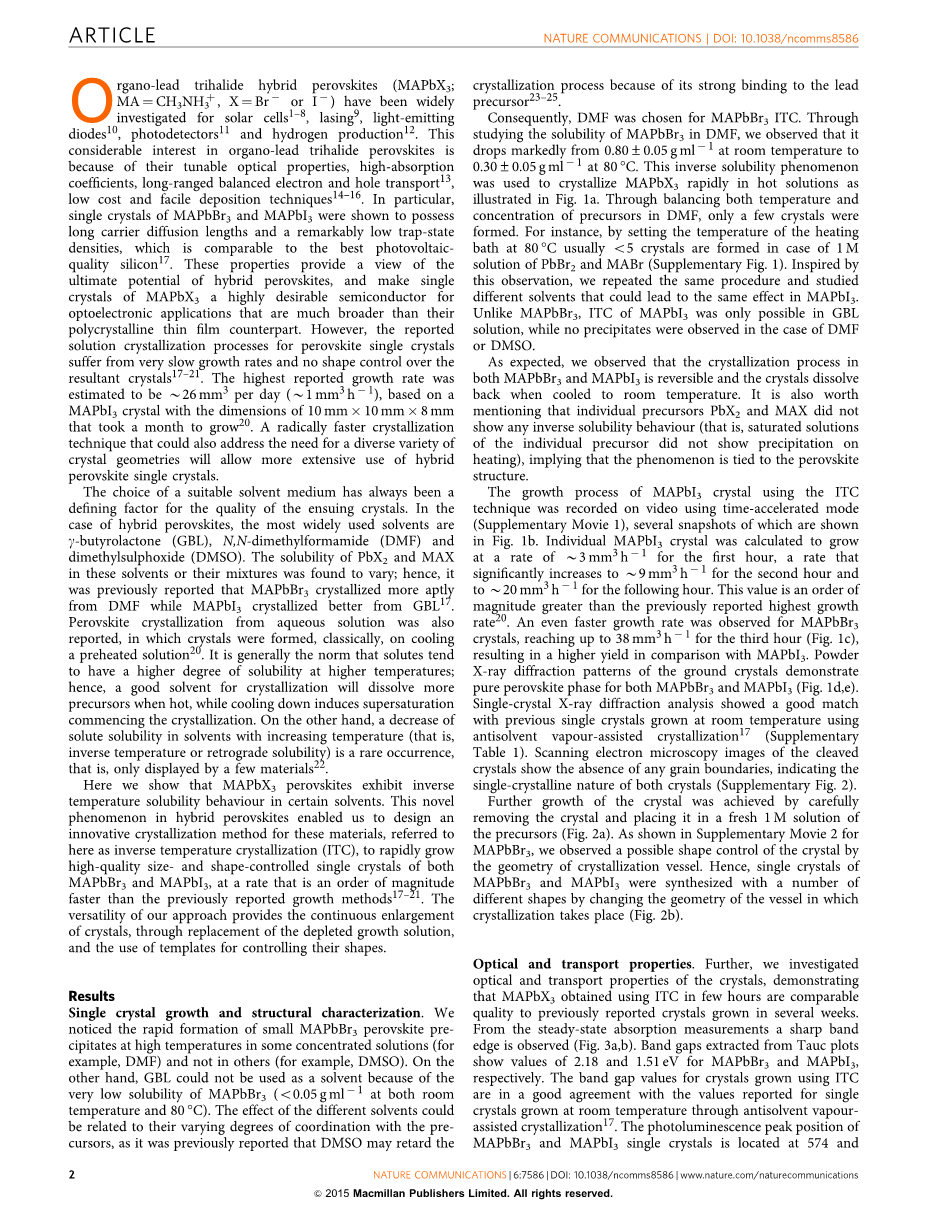 至此,我们的研究表明,在一定的溶剂MAPbX3钙钛矿具有逆溶解度特性温度。杂化钙钛矿这种奇特的现象使我们设计这些材料创新的结晶方法,这里称为逆温度结晶(ITC),MAPbBr3和MAPbI3都能控制快速成长的高质量单晶体的大小和形状,速度比以前报道的生长方法的速度快一个数量级。我们用不同的方法提供连续扩大的晶体,通过更换耗尽的生长溶液,和使用的模板,来控制它们的形状。