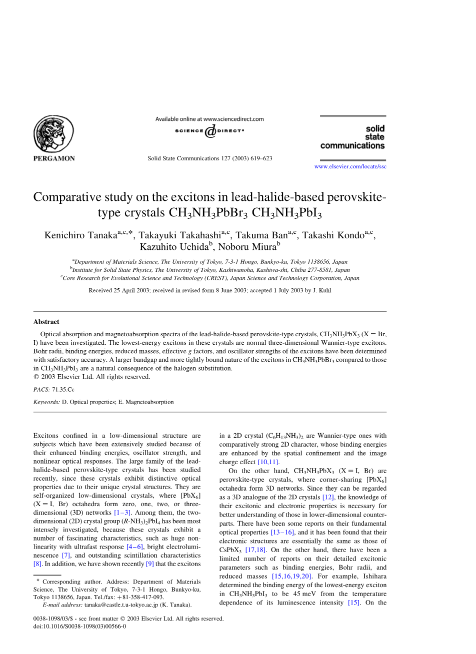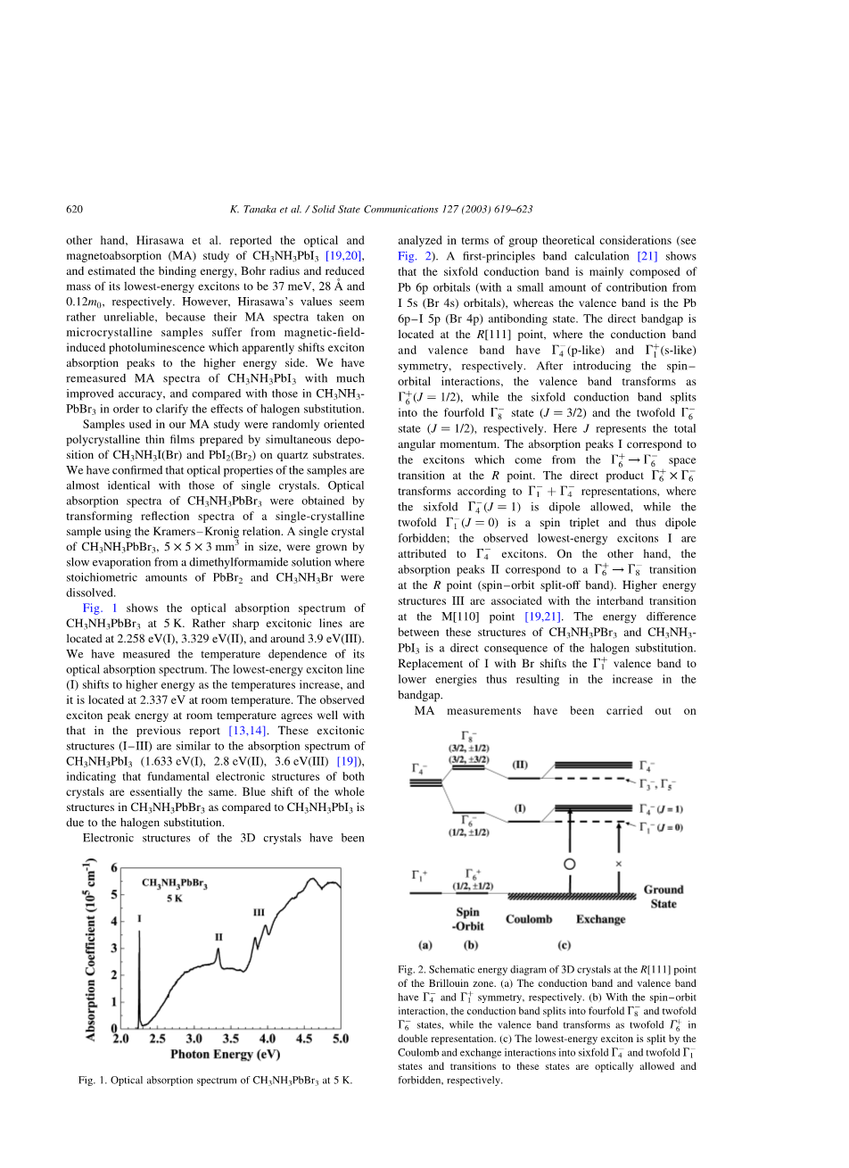 基于铅 - 卤化物的钙钛矿型晶体中的激子的比较研究 CH3NH3PbBr3与CH3NH3PbI3 |