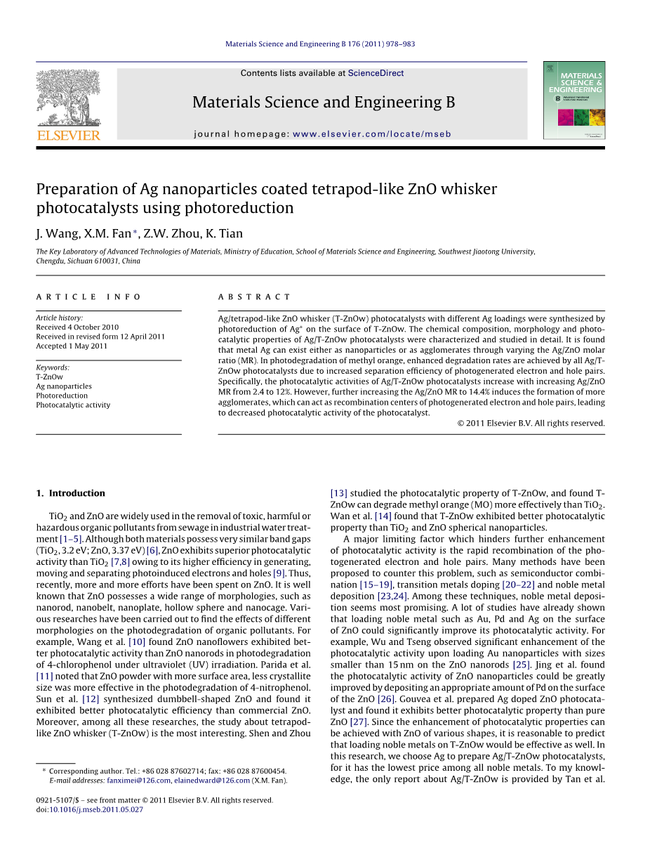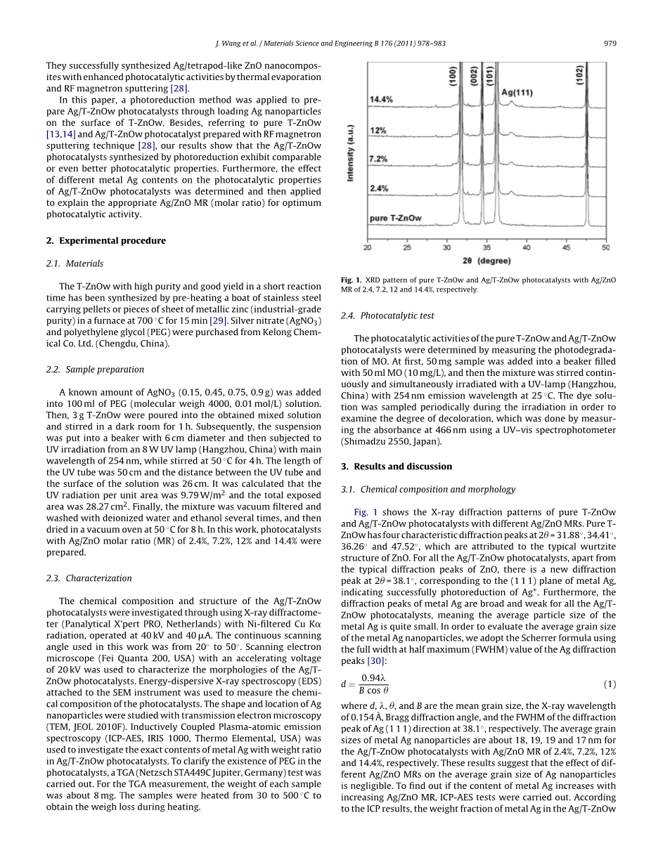 TiO2和ZnO广泛用于去除有毒,有害或工业水处理中的有害有机污染物[1-5]。尽管两种材料都具有非常相似的带隙(TiO2,3.2eV; ZnO,3.37eV)[6],ZnO表现出更高的光催化活性活性比TiO2 [7,8]由于其更高的生产效率,移动和分离光致电子和空穴[9]。因此,最近,越来越多的努力花费在ZnO上。众所周知ZnO具有广泛的形态,例如纳米棒,纳米带,纳米板,空心球和纳米笼。并已经进行了各种研究,以找出不同的形态对有机污染物光降解效率的影响。例如,王等。[10]发现ZnO纳米花粉在光降解中表现出比ZnO纳米棒更好的光催化活性的紫外线(UV)照射下的4-氯苯酚。 Parida等[11]指出,ZnO粉末具有更多的表面积,更少的微晶尺寸在4-硝基苯酚的光降解中更有效率。如孙等。[12]合成哑铃型ZnO并发现表现出比商业ZnO更好的光催化效率。此外,在所有这些研究中,关于四针状ZnO晶须(T-ZnOw)的研究是最有趣的。[13]研究了T-ZnOw的光催化性能,发现T-ZnOw可以比TiO2更有效地降解甲基橙(MO)。沈和周[14]发现T-ZnOw表现出比TiO2和ZnO球形纳米粒子更好的光催化性能。阻碍光催化活性进一步增强的主要限制因素是光生电子和空穴对的快速复合。已经提出了许多方法来对抗这个问题,如半导体组合[15-19],过渡金属掺杂[20-22]和重金属沉积[23,24]。在这些技术中,重金属沉积似乎是最有希望的。许多研究已经表明,在ZnO的表面上修饰重金属如Au,Pd和Ag可以显着提高其光催化活性。例如,Wu和Tseng在ZnO纳米棒上加载尺寸小于15nm的Au纳米颗粒,观察到光催化活性的显着提高[25]。 Jing等发现通过在表面上沉积适量的Pd可以大大提高ZnO纳米颗粒的光催化活性的ZnO [26]。 Gouvea等人制备的Ag掺杂ZnO光催化剂,发现它比纯ZnO具有更好的光催化性能[27]。由于可以通过各种形状的ZnO实现光催化性能的提高,所以可以合理地预测T-ZnOw上修饰重金属也是有效的。在这项研究中,我们选择Ag制备Ag / T-ZnOw光催化剂,因为在所有重金属中的价格最低。关于Ag / T-ZnOw的唯一报告由Tan等提供。他们通过热蒸发成功地合成了具有增强的光催化活性的Ag /四针状ZnO纳米复合材料和RF磁控溅射[28]。