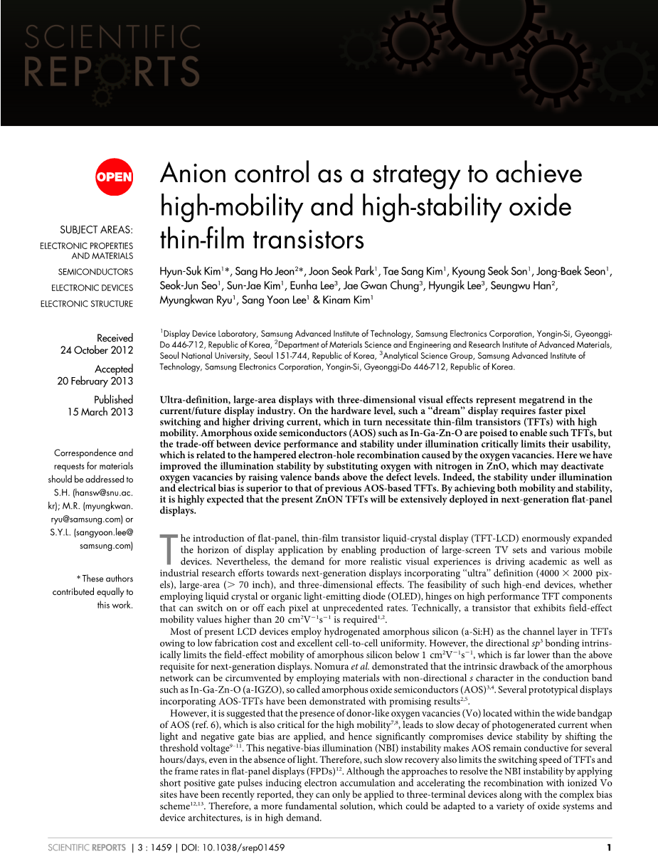 超清晰,具有立体视觉效果的大面积显示器代表了当前和未来显示产业的大趋势。在硬件层面,这样的“梦想”显示器需要更快的像素交换和更高的驱动电流,从而需要薄膜晶体管(TFT)具有高迁移率。非晶氧化物半导体(AOS),如非晶铟镓锌氧(In-Ga-Zn-O)正准备被用来实现这样的TFT,但是器件的性能和在光照条件下的稳定性之间的权衡严格限制了非晶氧化物薄膜晶体管的应用,这主要是由于氧空位阻碍了电子-空穴的复合。在这里,我们在ZnO中用氮代替氧来改进光照条件下的稳定性,它是通过将价带提高到缺陷能级之上来抑制氧空位。在光照下的稳定性和电偏压特性的确优于先前的非晶氧化物薄膜晶体管。通过同时实现高迁移率和稳定性,ZnON基TFT将被高度期望会广泛运用在下一代平板显示器中。
