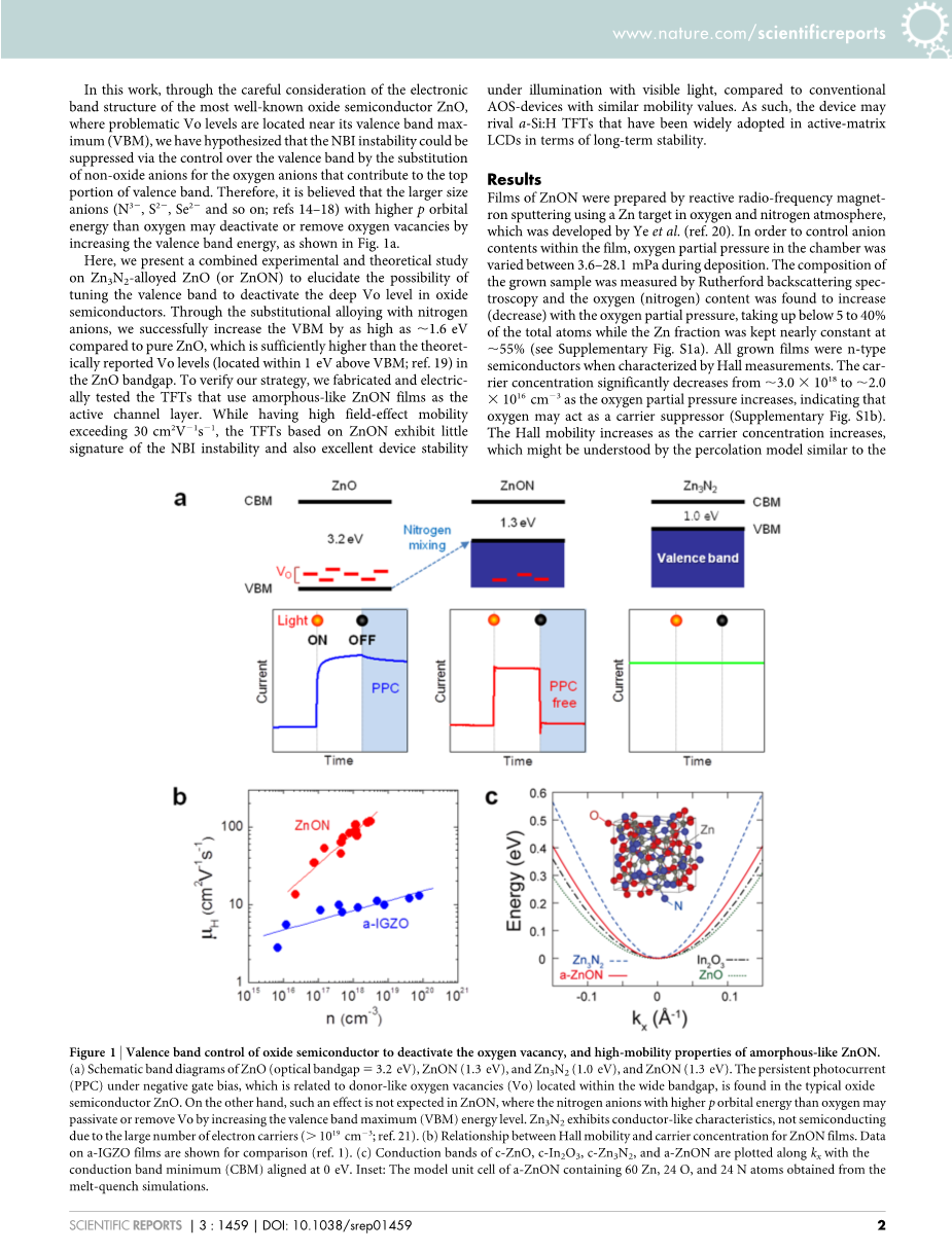在这里,我们提出了一个结合理论和实验的研究,在ZnO(或ZnON)中参杂Zn3N2,以此去证明在氧化物半导体中用调整价带的方法来抑制深能级的氧空位的可能性。与纯的ZnO相比,通过参杂氮阴离子,我们成功地将价带顶(VBM)增加了1.6eV,这已足够高于理论报道中,纯ZnO带隙中的氧空位能级[19](位置在高于价带顶1eV处)。为了验证我们的理论,我们制作出使用非晶体ZnON薄膜作为有效沟道层的TFTs,并对其进行了电测试。当场效应迁移率超过30cm2 V-1S-1时,相比具有相识迁移量的常规非晶体氧化物半导体(AOS)设备,基于ZnON的薄膜晶体管(TFT)在可见光的照射下表现出小幅的NBI不稳定性和良好的器件稳定性。因此,该装置可以媲美的a-Si:H薄膜晶体管,在长期稳定性方面,其已经被广泛应用在有源矩阵液晶显示器中。