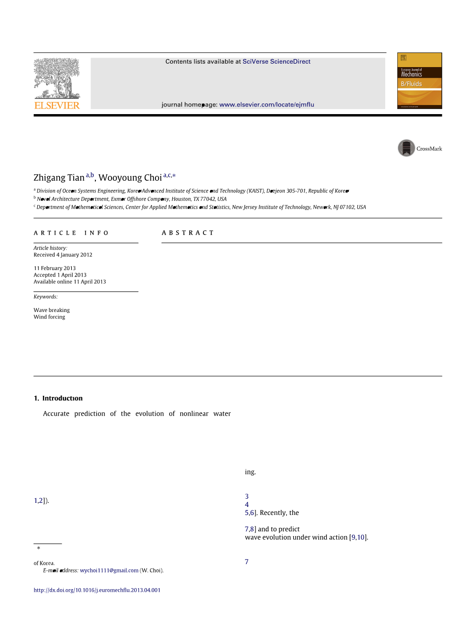 风对非线性水波的演化的影响可以通过在动态自由表面边界条件中引入外表面压力来建模。一个模型假设风引起的压力与波表面坡度同相,并且取决于由于风力作用在表面上的摩擦速度[6]。该模型源自Miles的剪切流动不稳定理论[7],用于产生波浪,并假设没有气流分离。利用这个简单的模型,Banner和Song基于局部能量收敛速度研究了风力强迫效应对破波准则的性能。此外,Kalmikov使用光谱法对风力作用下非线性水波的演化进行了确定性预测。这两个数值研究都没有提供这种风力模型的性能的实验评估。