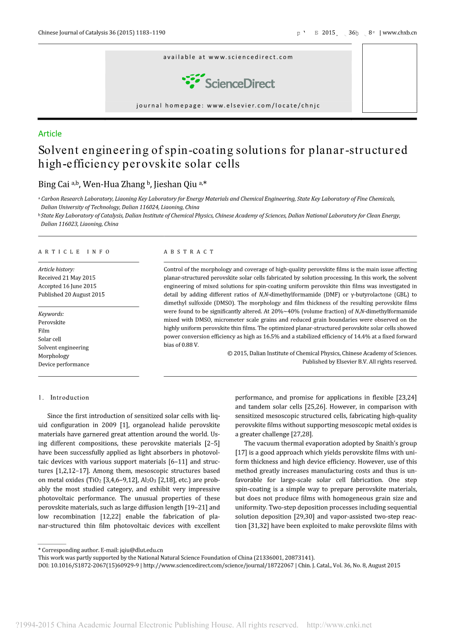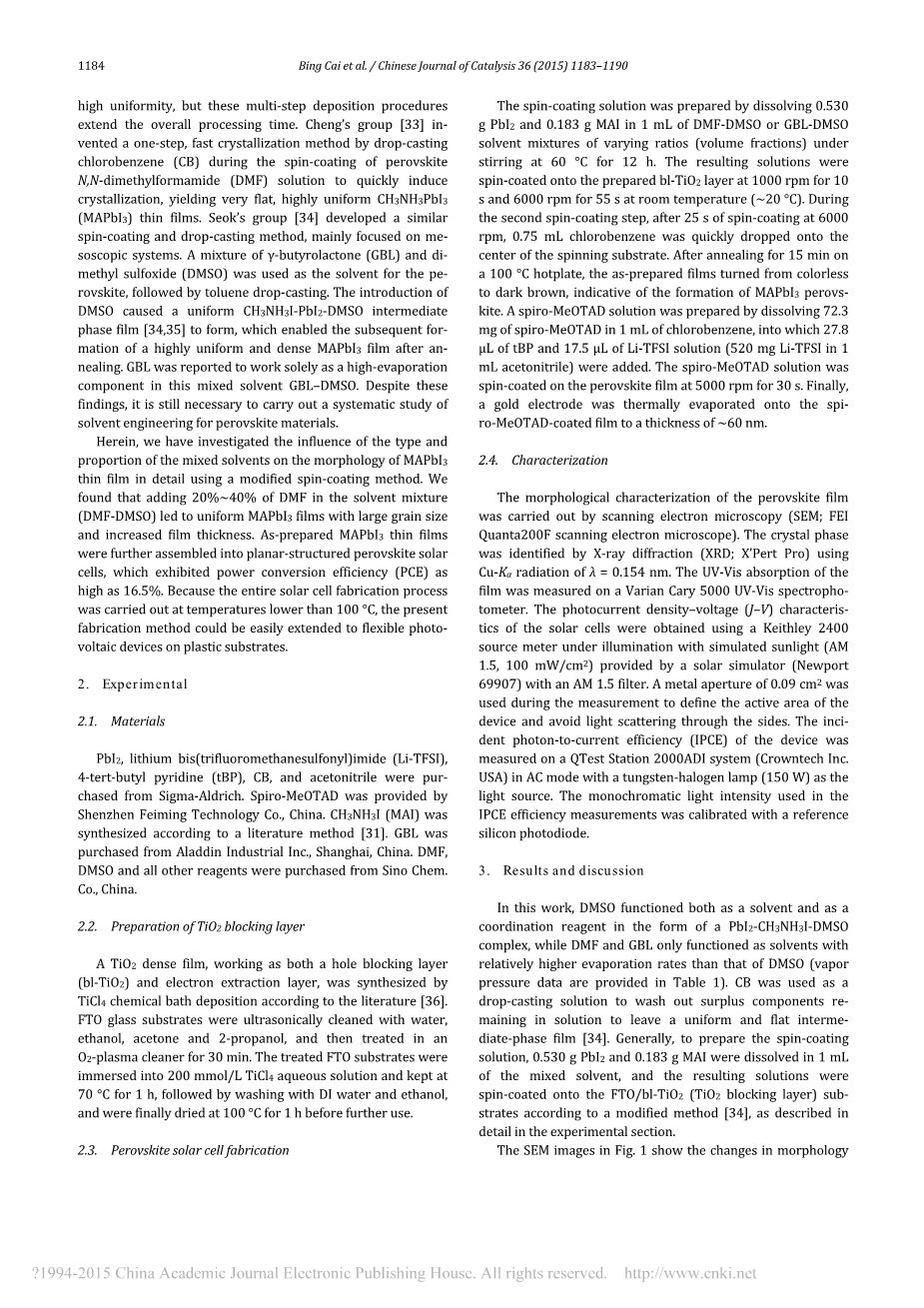 通过在60℃搅拌下将0.530g PbI 2和0.183g MAI溶解在1mL不同比例(体积分数)的DMF-DMSO或GBL-DMSO溶剂混合物中12小时来制备旋涂溶液。将得到的溶液在室温(〜20℃)下以1000rpm旋涂10秒和6000转/分钟,在制备的b1-TiO2层上旋涂55秒。在第二次旋涂步骤中,在以6000rpm旋涂25秒后,将0.75mL氯苯迅速滴落到纺丝基材的中心。在100℃电热板上退火15分钟后,所制备的膜从无色转变成深棕色,表明形成MAPbI3钙钛矿。通过将72.3mg螺-MeOTAD溶解在1mL氯苯中制备螺 - MeOTAD溶液,其中加入27.8mu;LtBP和17.5mu;LLi-TFSI溶液(520mg Li-TFSI在1mL乙腈中)。螺旋-MeOTAD溶液以5000rpm旋转30秒,在钙钛矿膜上旋涂。最后,将金电极热蒸发到螺旋-MoOTAD涂膜上至40〜60nm的厚度。