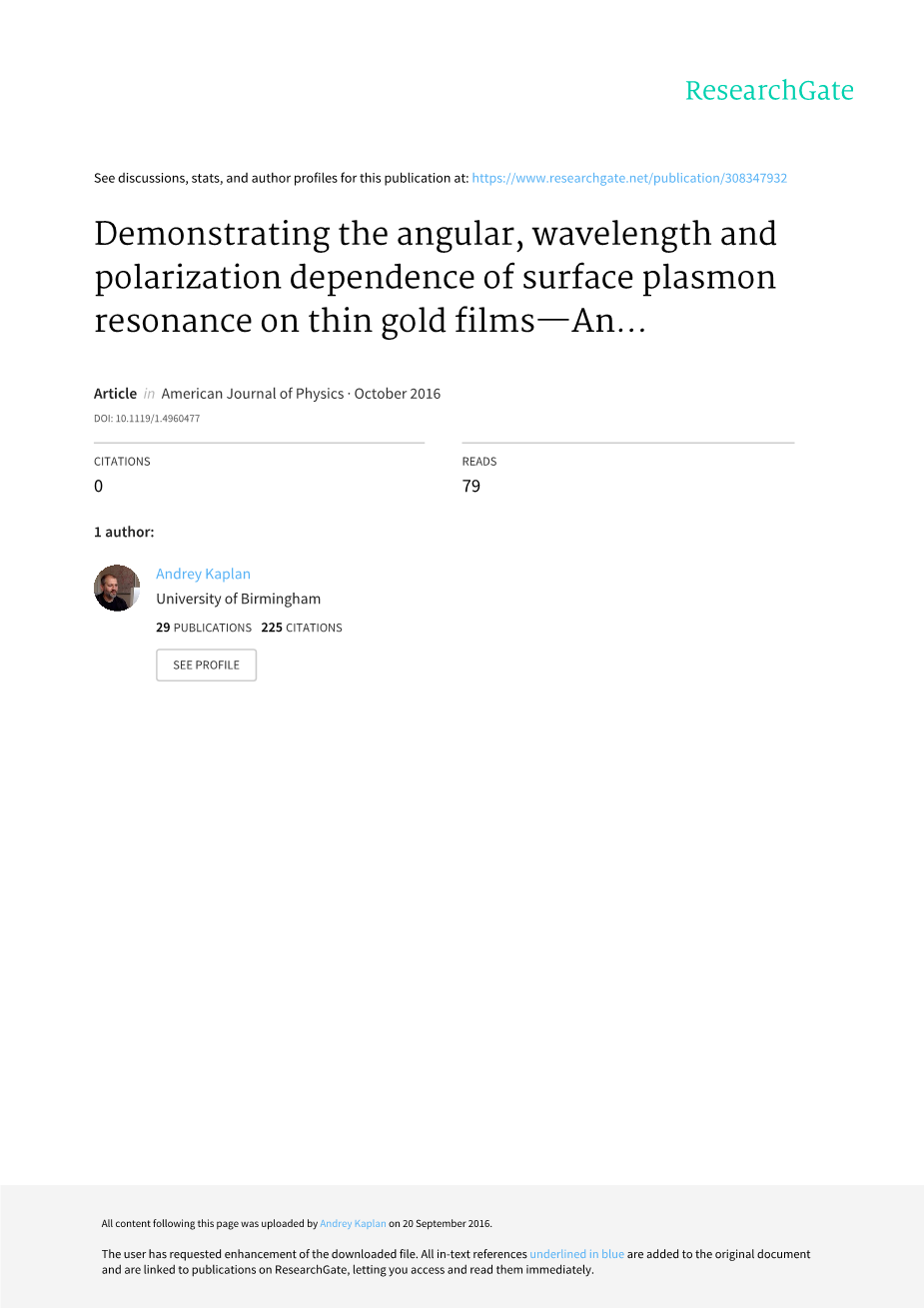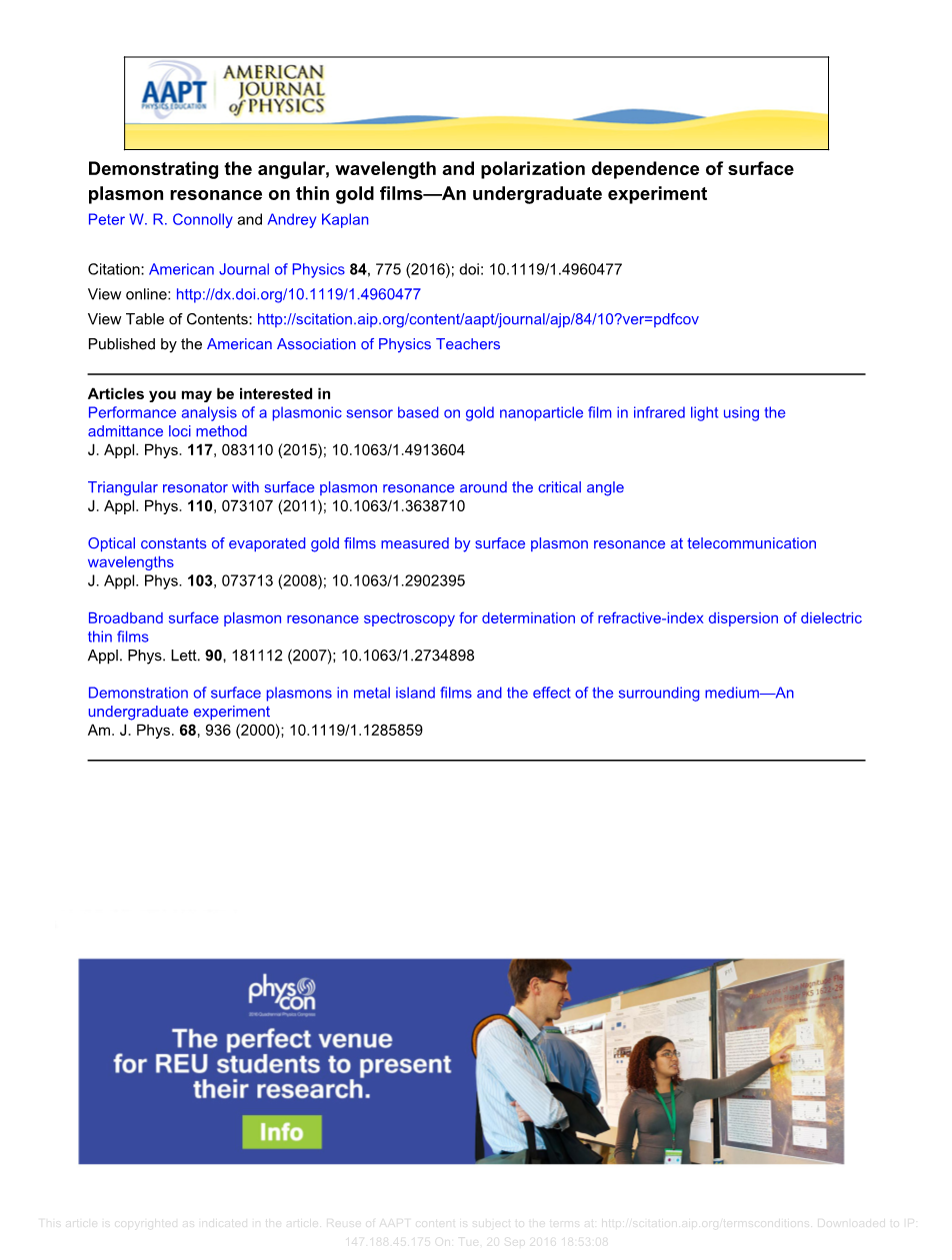 这篇文章介绍了一个十分简单且容易上手的光学系统在检测光耦合进一个薄金膜的表面等离子体共振时基本属性的能力。整个装置,包括一个可旋转的衰减全反射设备,反射光可以从这个设备中通过一个抛物面镜汇聚。这样的话可允许在不移动探测器的前提情况下研究反射光强度对入射角的依赖性。它也可以方便地变换光源或者合并适合研究不同波长下的表面等离子体共振的宽带源。实验数据的理论模拟方法以及探索在表面传播的物理光激发波的直接计算是已知的。