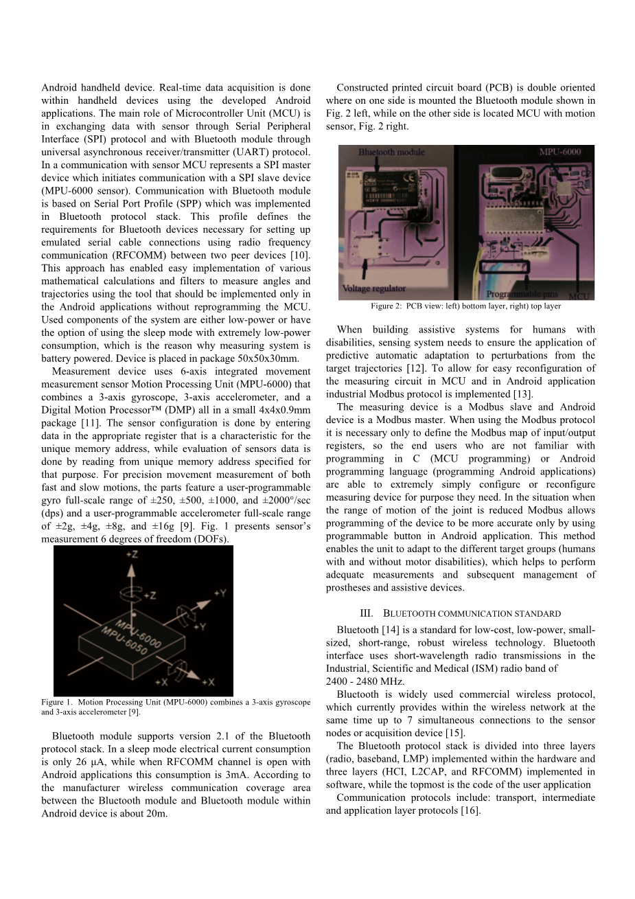 蓝牙模块支持蓝牙协议栈的版本为蓝牙2.1。 在睡眠模式下,电流消耗仅为26mu;A,Android应用开启RFCOMM通道时消耗电流为3mA。根据制造商的说法,蓝牙模块和Android设备内的蓝牙模块之间的无线通信覆盖区域约为20米。构造的印刷电路板(PCB)是双向的,其一侧安装有蓝牙模块,而另一侧安装有带运动传感器的MCU。