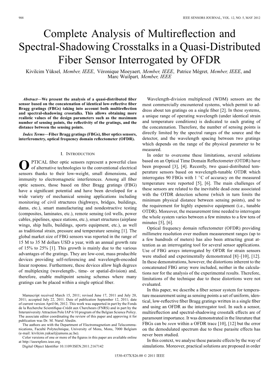 索引术语 :光纤布拉格光栅(FBG),光纤传感器,干涉测量,光频域反射计(OFDR)。