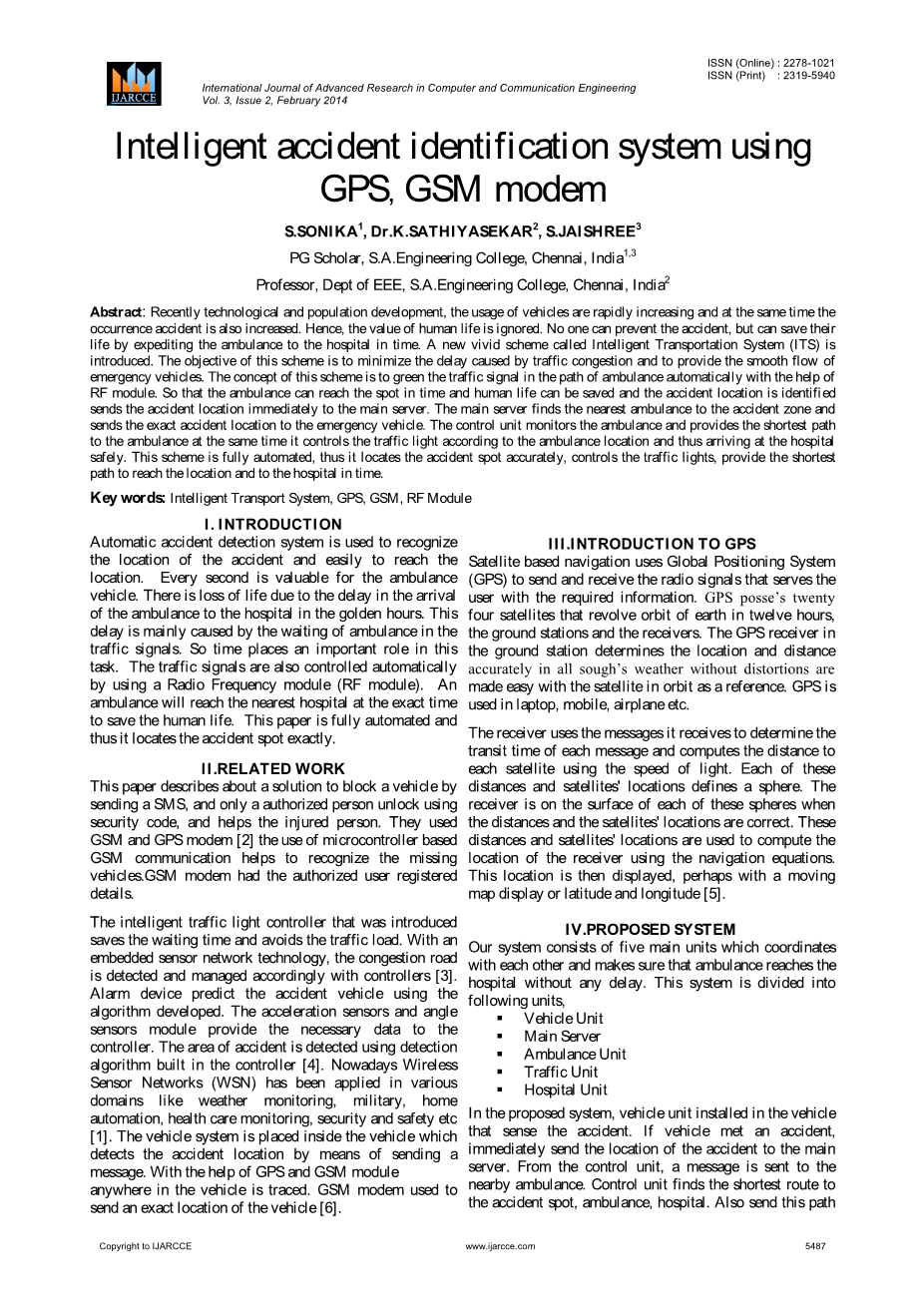 本文介绍一个解块方案,能够通过发送一个短信来定位坐标,只有被授权的人才能解锁使用接收安全代码,并帮助受伤的人。他们用GSM模块和GPS调制解调器,基于GSM通信微波定位来辨别迷失的方位。GSM调制解调器已授权用户注册信息。智能交通灯控制的推广节省了等待的时间,避免了交通拥堵。利用嵌入式传感器网络技术,通过控制器检测和管理堵塞道路。报警装置利用先进算法预测事故车辆,加速度传感器和角速度传感器提供必要的数据给控制者。事故发生区域通过控制器检测算法。如今,无线传感器网络已经被广泛应用于各个领域,如天气探测、军事、家庭自动化、医疗保健检测、安保和安防等等。放置在车辆中的系统通过发送信息来定位事故地点。随着GPS和GSM短信模块在追踪方面的到处应用,GSM调制解调器被用来传送车辆的确切位置。