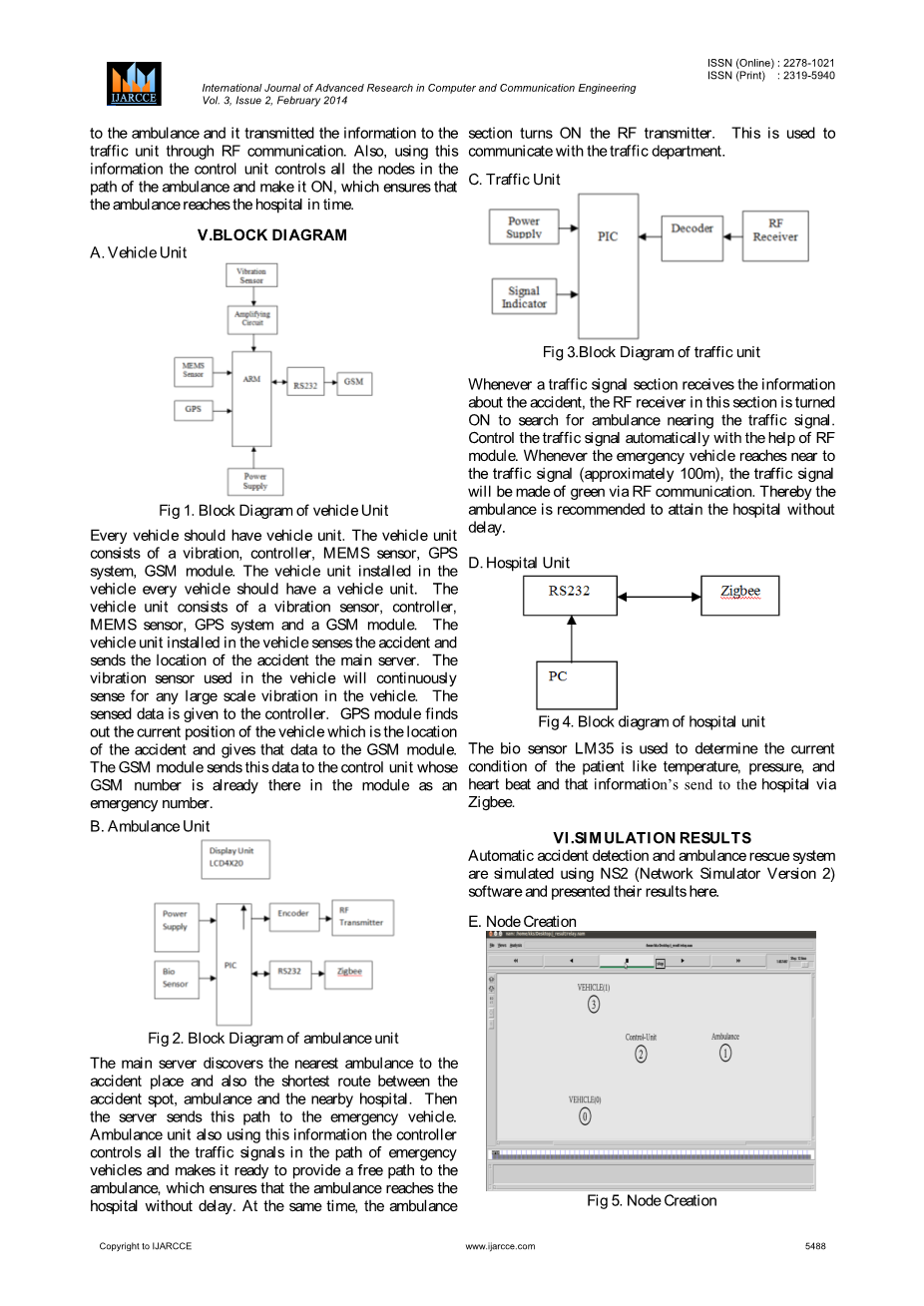 在这个被推荐的系统中,车辆单元被安置在车辆中来感应事故。当车辆遇到事故时,立刻将事故位置发送到主服务器。从控制单元处发送信息到就近的救护车。控制单元找到距离事故发生位置最近的路程、救护车、医院。同时也给救护车发送路线,而且它也通过射频通信给交通模块传送信息。所以,利用这些信息控制单元控制路线上的所有救护车,并且让它一路畅通,从而保证救护车及时到达医院。