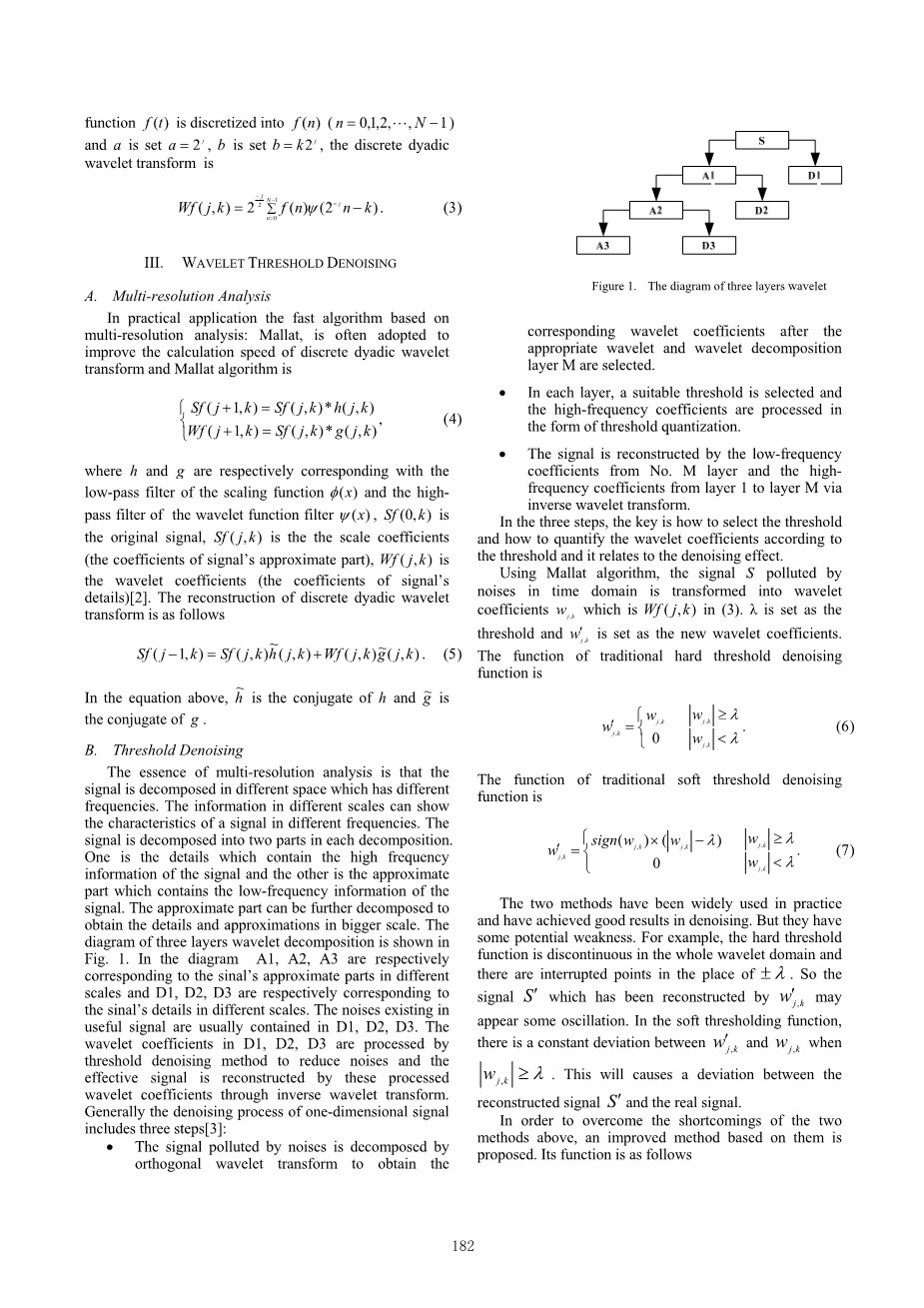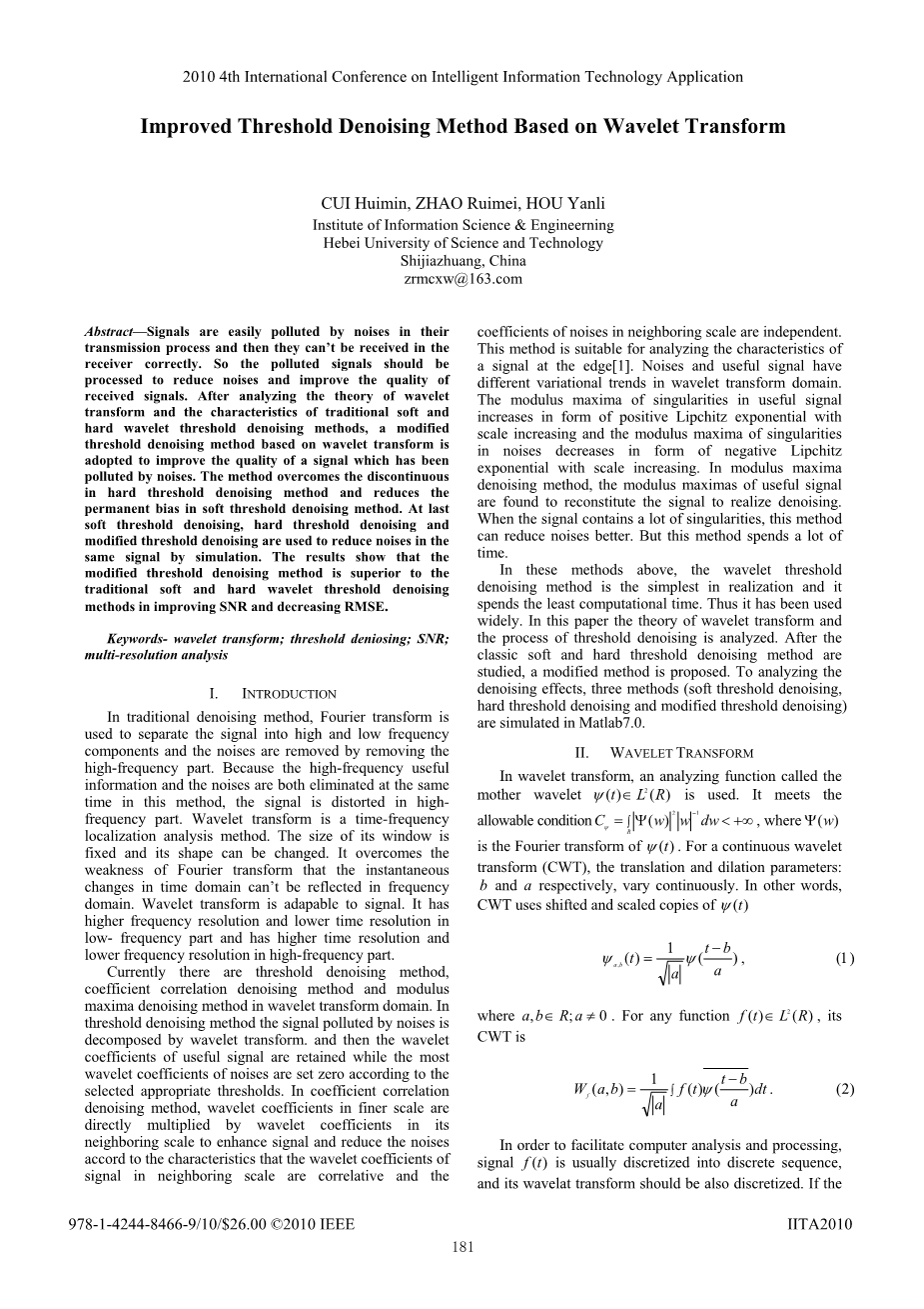 [3] ZHU Hua, WU Chuan-sheng, WANG Xiao-mei, “Signal de-noising in wavelet based on new threshold function,” Computer Application, vol. 127, pp. 2605–2609, October 2007.